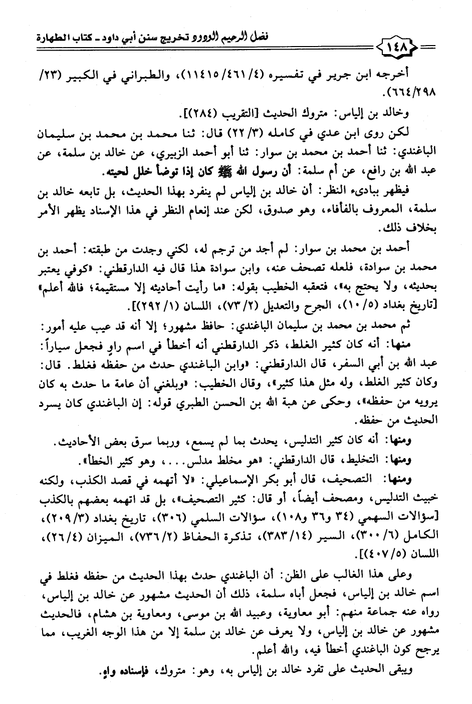 وعلى هذا الغالب على الظن: أن الباغندي حدث بهذا الحديث من حفظه فغلط في اسم خالد بن إلياس، فجعل أباه سلمة، ذلك أن الحديث مشهور عن خالد بن إلياس، رواه عنه جماعة منهم: أبو معاوية، وعبيد الله بن موسى، ومعاوية بن هشام، فالحديث مشهور عن خالد بن إلياس، ولا يعرف عن خالد بن سلمة إلا من هذا الوجه الغريب، مما يرجح كون الباغندي أخطأ فيه، والله أعلم.