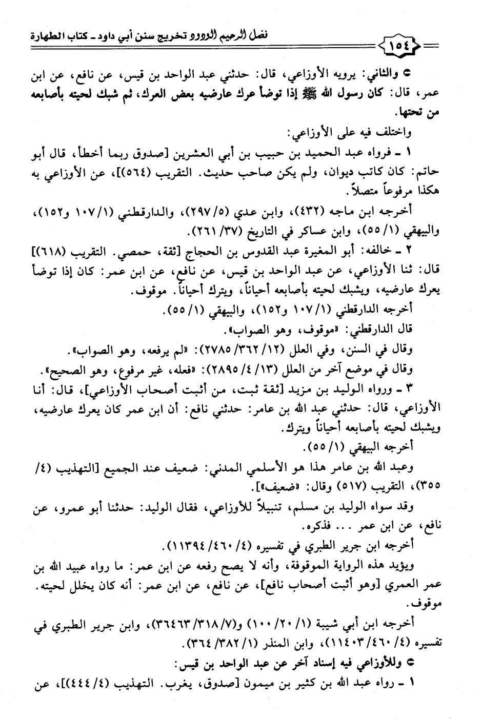 ٢ - خالفه: أبو المغيرة عبد القدوس بن الحجاج [ثقة، حمصي. التقريب (٦١٨)] قال: ثنا الأوزاعي، عن عبد الواحد بن قيس، عن نافع، عن ابن عمر: كان إذا توضأ يعرك عارضيه، ويشبك لحيته باصابعه أحيانًا، ويترك أحيانًا. موقوف.