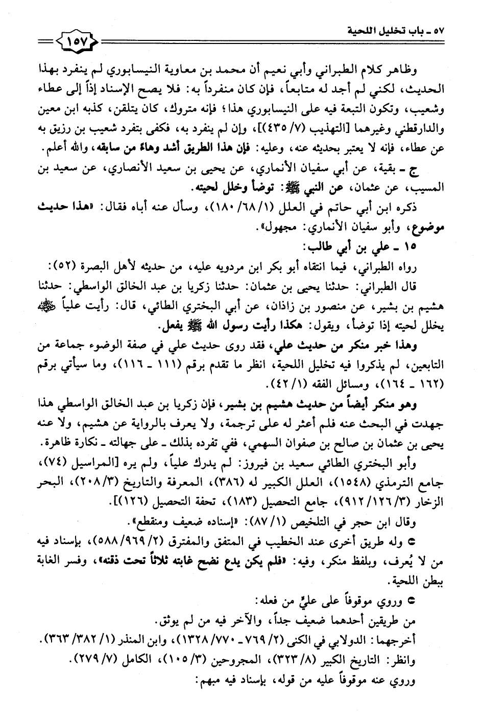 رواه الطبراني، فيما انتقاه أبو بكر ابن مردويه عليه، من حديثه لأهل البصرة (٥٢): قال الطبراني: حدثنا يحيى بن عثمان: حدثنا زكريا بن عبد الخالق الواسطي: حدثنا هشيم بن بشير، عن منصور بن زاذان، عن أبي البختري الطائي، قال: رأيت عليًّا - رضي الله عنه - يخلل لحيته إذا توضأ، ويقول: هكذا رأيت رسول الله - صلى الله عليه وسلم - يفعل. وهذا خبر منكر من حديث علي، فقد روى حديث علي في صفة الوضوء جماعة من التابعين، لم يذكروا فيه تخليل اللحية، انظر ما تقدم برقم (١١١ - ١١٦)، وما سيأتي برقم (١٦٢ - ١٦٤)، ومسائل الفقه (١/ ٤٢).