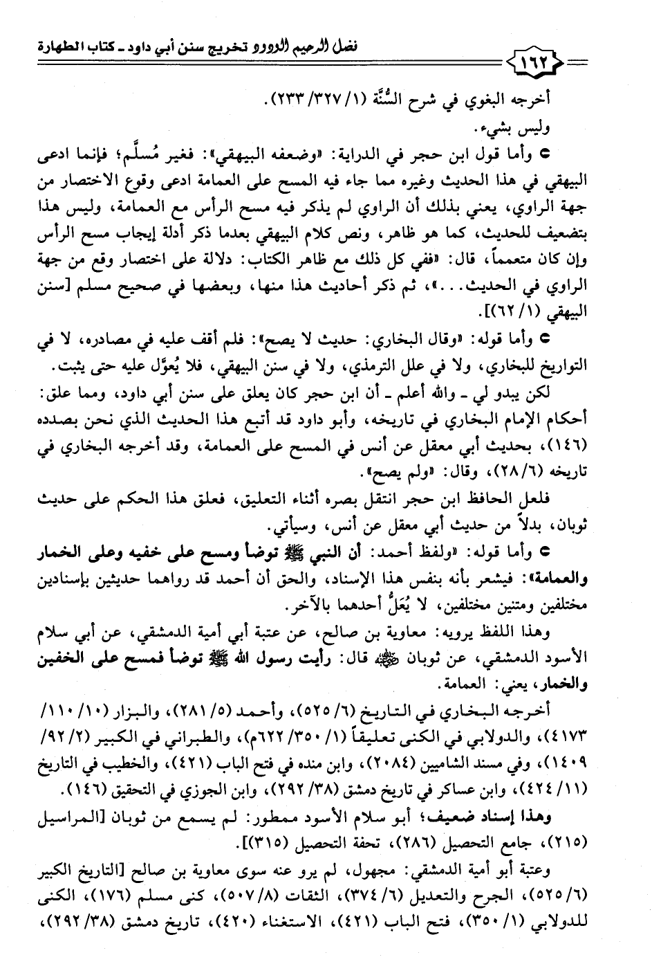 • وأما قول ابن حجر في الدراية: "وضعفه البيهقي": فغير مُسلَّم؛ فإنما ادعى البيهقي في هذا الحديث وغيره مما جاء فيه المسح على العمامة ادعى وقوع الاختصار من جهة الراوي، يعني بذلك أن الراوي لم يذكر فيه مسح الرأس مع العمامة، وليس هذا بتضعيف للحديث، كما هو ظاهر، ونص كلام البيهقي بعدما ذكر أدلة إيجاب مسح الرأس لهان كان متعممًا، قال: "ففي كل ذلك مع ظاهر الكتاب: دلالة على اختصار وقع من جهة الراوي في الحديث ... "، ثم ذكر أحاديث هذا منها، وبعضها في صحيح مسلم [سنن البيهقي (١/ ٦٢)].