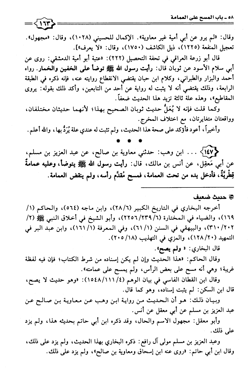 ١٤٧ - . . . ابن وهب: حدثني معاوية بن صالح، عن عبد العزيز بن مسلم، عن أبي مَعقِل، عن أنس بن مالك، قال: رأيت رسول الله - صلى الله عليه وسلم - يتوضأ، وعليه عمامةٌ قِطْريَّةٌ، فأدخل يده من تحت العمامة، فمسح مُقدَّم رأسه، ولم ينقض العمامة.