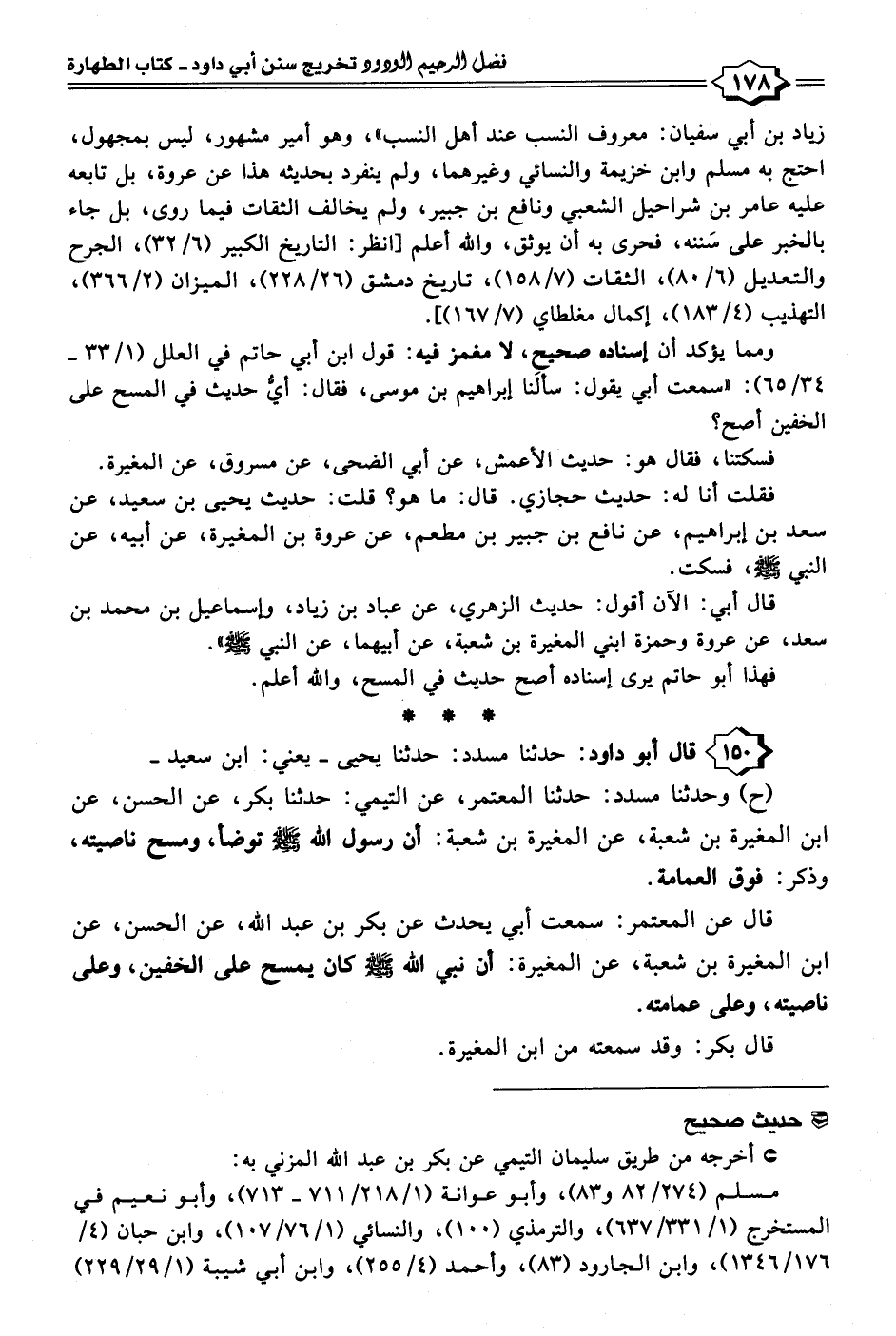 ١٥٠ - قال أبو داود: حدثنا مسدد: حدثنا يحيى -يعني: ابن سعيد- (ح) وحدثنا مسدد: حدثنا المعتمر، عن التيمي: حدثنا بكر، عن الحسن، عن ابن المغيرة بن شعبة، عن المغيرة بن شعبة: أن رسول الله - صلى الله عليه وسلم - توضأ، ومسح ناصيته، وذكر: فوق العمامة.
