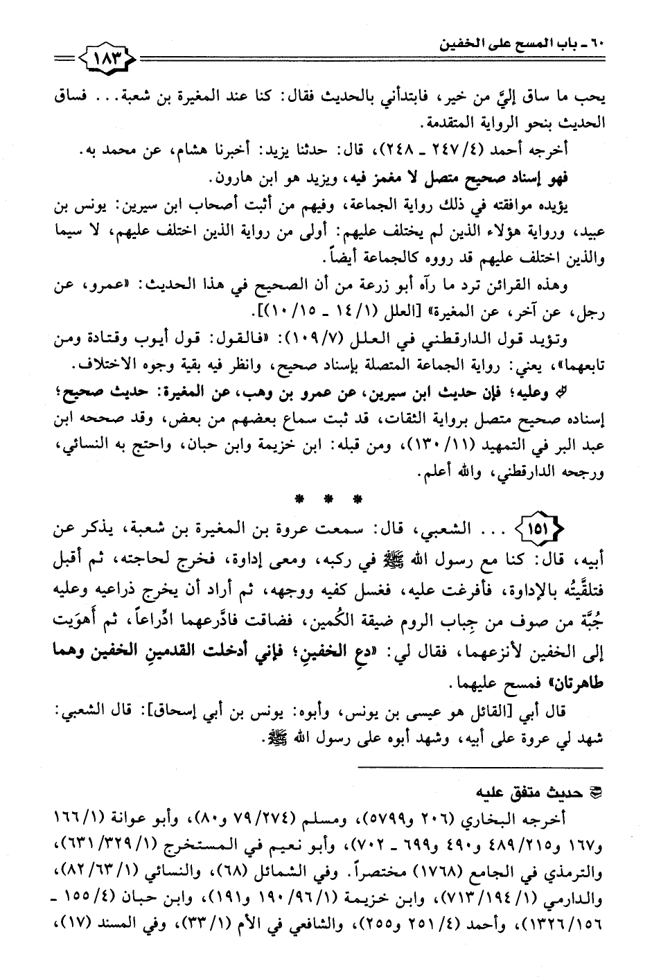 ١٥١ - . . . الشعبي، قال: سمعت عروة بن المغيرة بن شعبة، يذكر عن أبيه، قال: كنا مع رسول الله - صلى الله عليه وسلم - في ركبه، ومعي إداوة، فخرج لحاجته، ثم أقبل فتلقَّيتُه بالإداوة، فأفرغت عليه، فغسل كفيه ووجهه، ثم أراد أن يخرج ذراعيه وعليه جُبَّة من صوف من جِباب الروم ضيقة الكُمين، فضاقت فادَّرعهما ادِّراعًا، ثم أَهوَيت إلى الخفين لأنزعهما، فقال لي: "دعِ الخفينِ؛ فإني أدخلت القدمينِ الخفين وهما طاهرتان" فمسح عليهما.