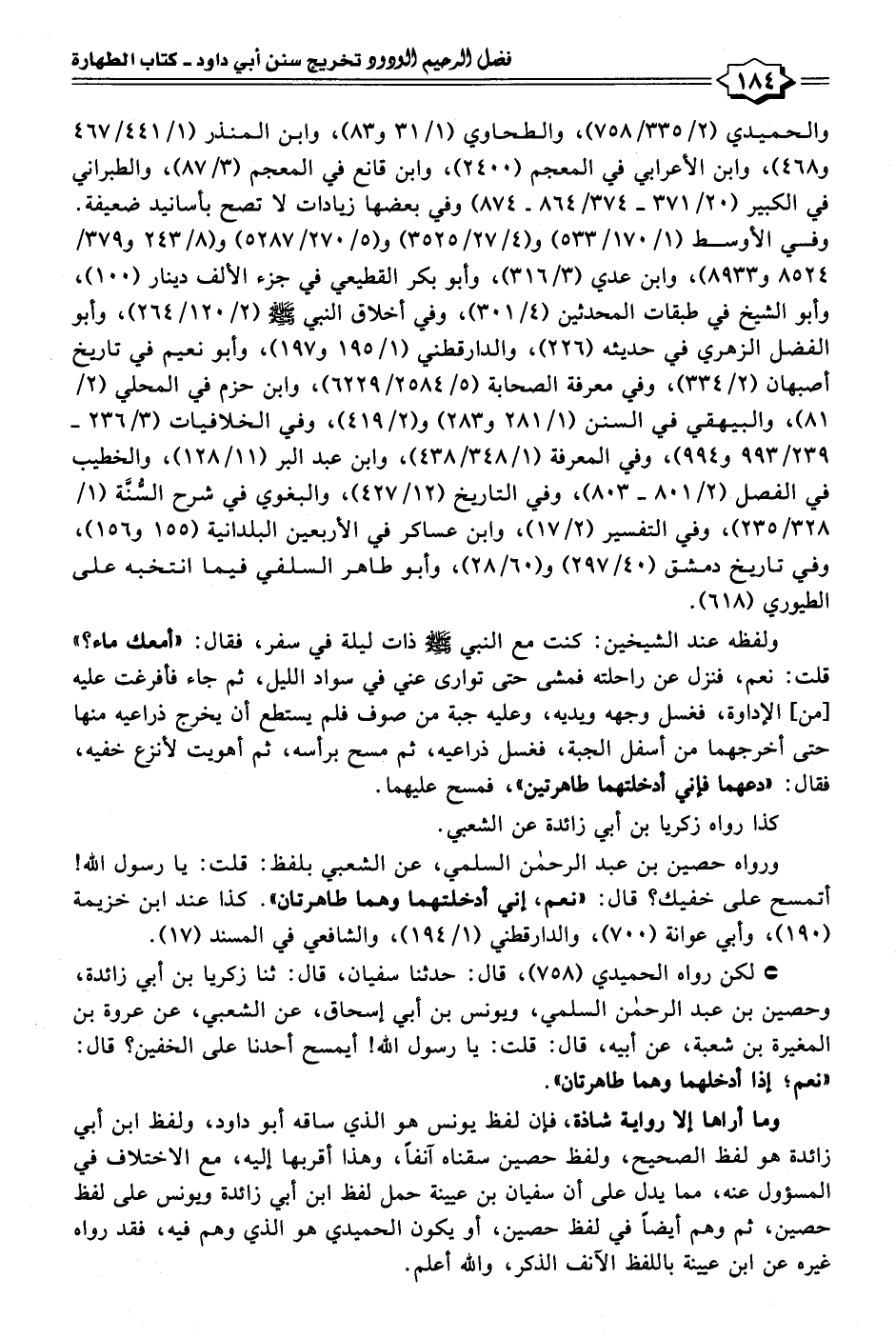 ورواه حصين بن عبد الرحمن السلمي، عن الشعبي بلفظ: قلت: يا رسول الله! أتمسح على خفيك؟ قال: "نعم، إني أدخلتهما وهما طاهرتان". كذا عند ابن خزيمة (١٩٠)، وأبي عوانة (٧٥٠)، والدارقطني (١/ ١٩٤)، والشافعي في المسند (١٧).