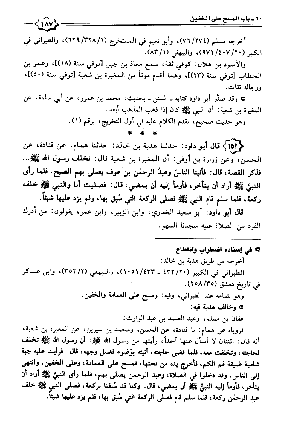 ١٥٢ - . . . قال أبو داود: حدثنا هدبة بن خالد: حدثنا همام، عن قتادة، عن الحسن، وعن زرارة بن أوفى: أن المغيرة بن شعبة قال: تخلف رسول الله - صلى الله عليه وسلم - . . . فذكر القصة، قال: فأتينا الناسَ وعبدُ الرحمن بن عوف يصلى بهم الصبح، فلما رأى النبيَّ - صلى الله عليه وسلم - أراد أن يتأخر، فأومأ إليه أن يمضي، قال: فصليت أنا والنبي - صلى الله عليه وسلم - خلفه ركعة، فلما سلم قام النبي - صلى الله عليه وسلم - فصلى الركعة التي سُبق بها، ولم يزد عليها شيئًا.