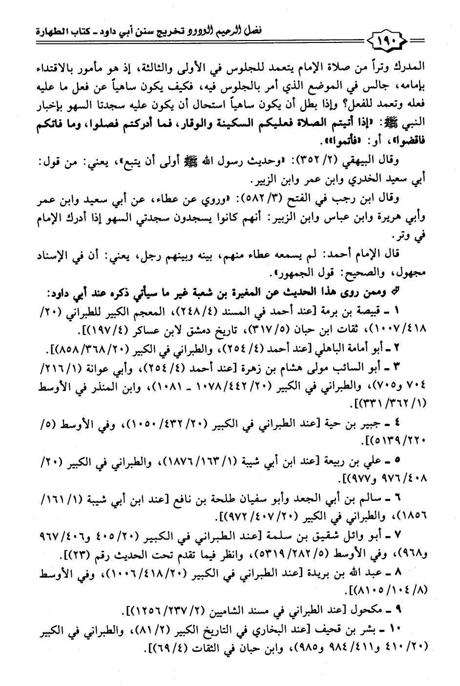 وقال ابن رجب في الفتح (٣/ ٥٨٢): "وروي عن عطاء، عن أبي سعيد وابن عمر وأبي هريرة وابن عباس وابن الزبير: أنهم كانوا يسجدون سجدتي السهو إذا أدرك الإمام في وتر.