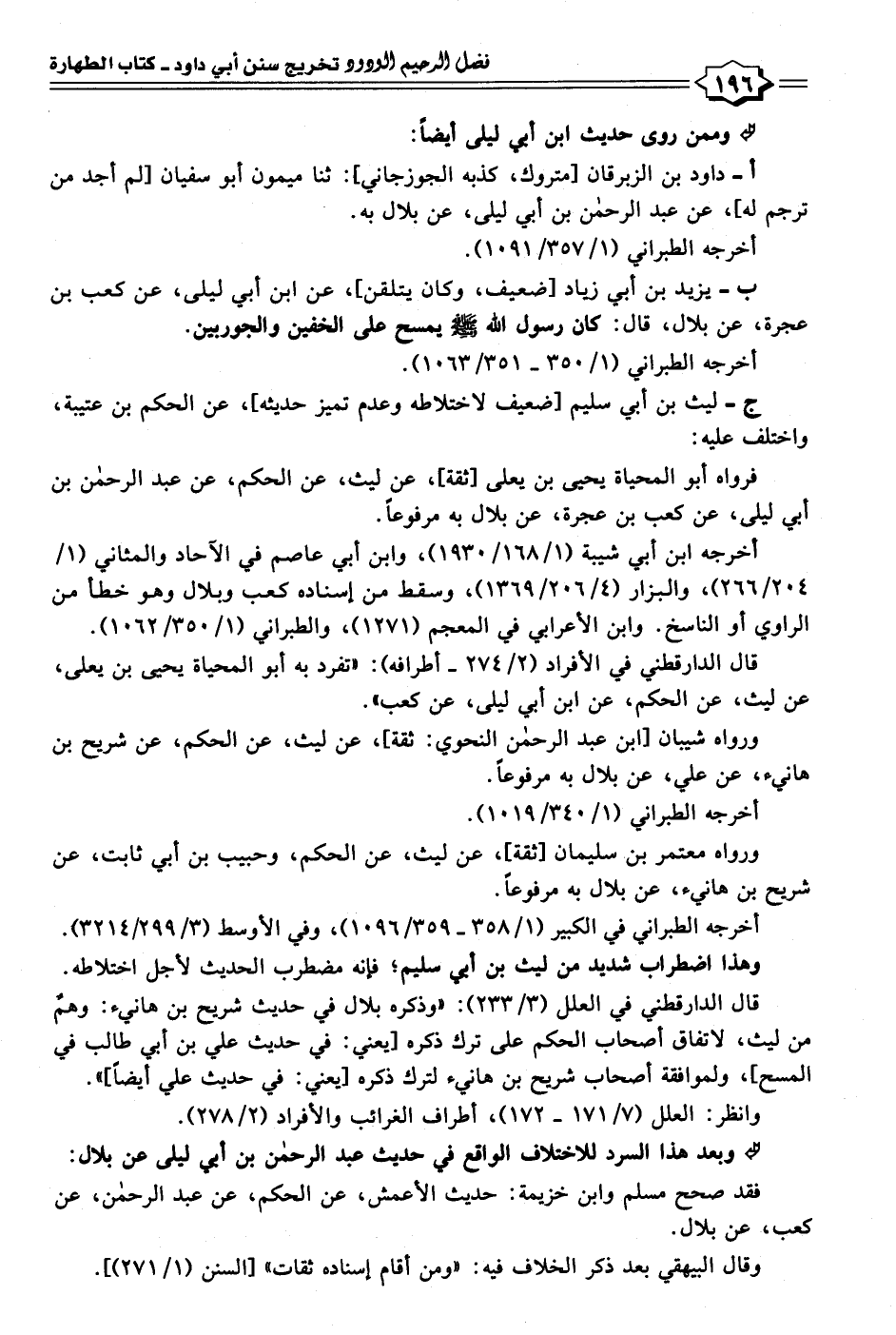 ب- يزيد بن أبي زياد [ضعيف، وكان يتلقن]، عن ابن أبي ليلى، عن كعب بن عجرة، عن بلال، قال: كان رسول الله - صلى الله عليه وسلم - يمسح على الخفين والجوربين.