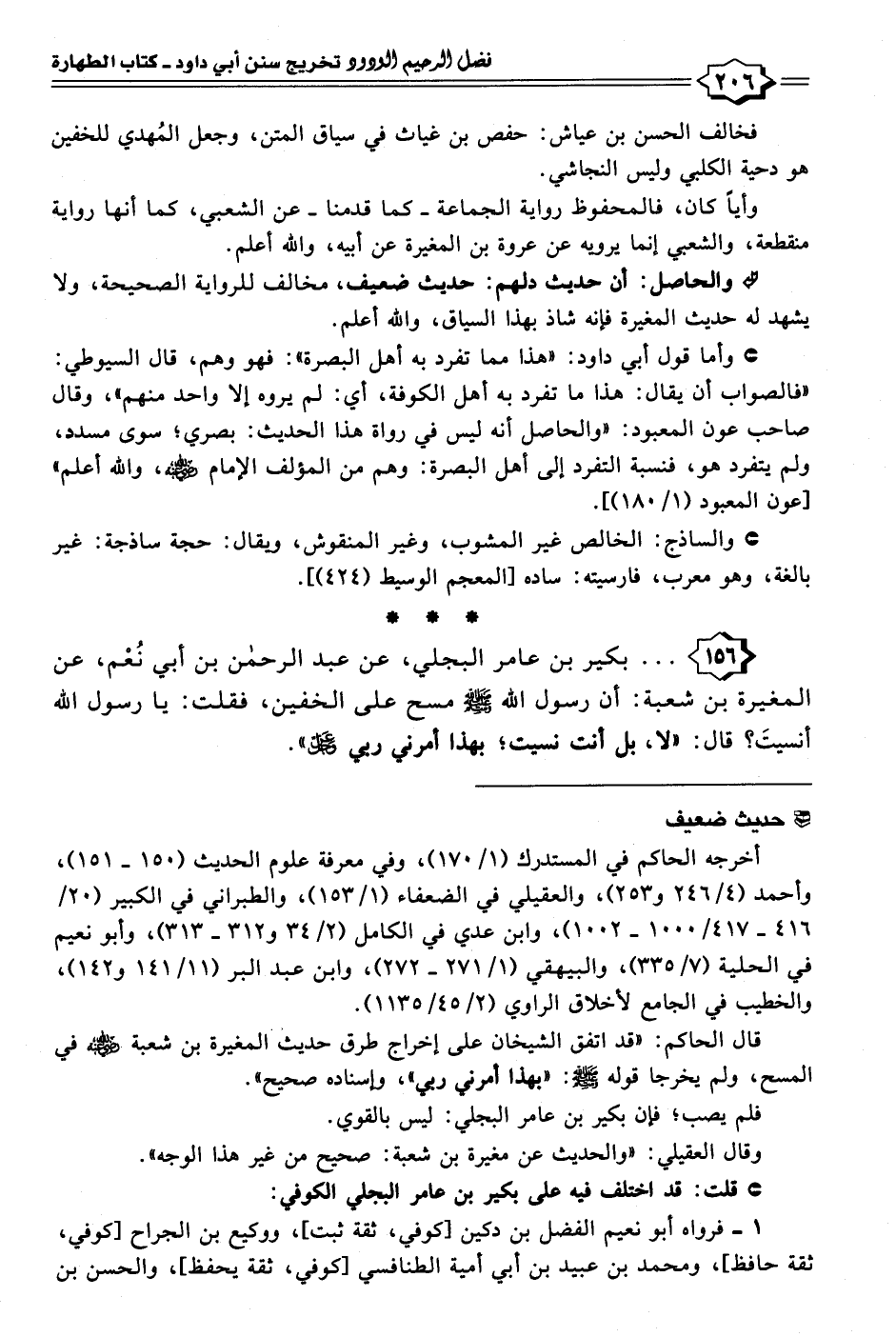 ١٥٦ - . . . بكير بن عامر البجلي، عن عبد الرحمن بن أبي نُعْم، عن المغيرة بن شعبة: أن رسول الله - صلى الله عليه وسلم - مسح على الخفين، فقلت: يا رسول الله أنسيتَ؟ قال: "لا، بل أنت نسيت؛ بهذا أمرني ربي عز وجل".