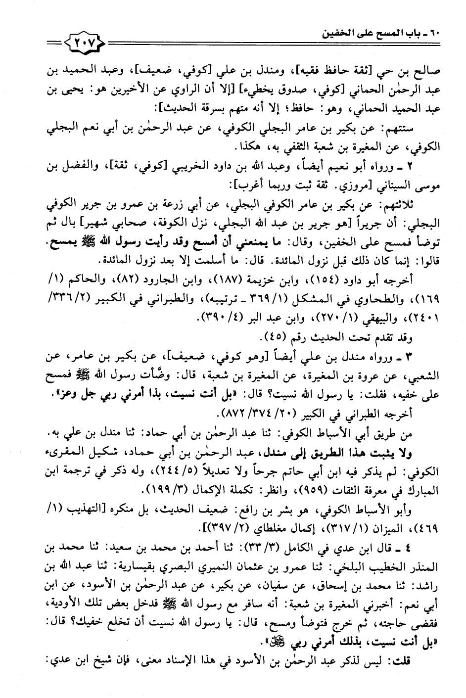 ٣ - ورواه مندل بن علي أيضًا [وهو كوفي، ضعيف]، عن بكير بن عامر، عن الشعبي، عن عروة بن المغيرة، عن المغيرة بن شعبة، قال: وضَّأت رسول الله - صلى الله عليه وسلم - فمسح على خفيه، فقلت: يا رسول الله نسيت؟ قال: "بل أنت نسيت، بذا أمرني ربي جل وعز".