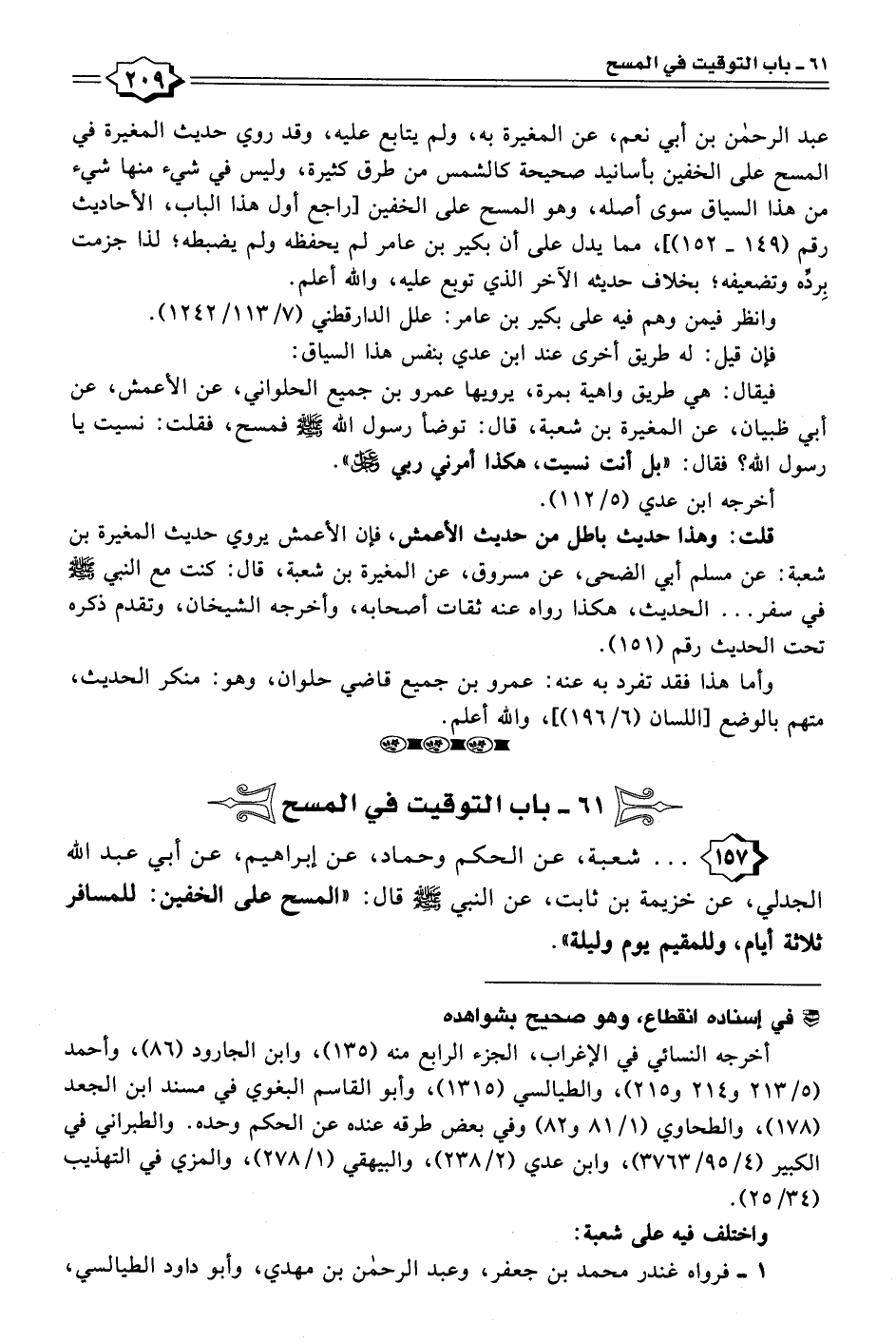عبد الرحمن بن أبي نعم، عن المغيرة به، ولم يتابع عليه، وقد روي حديث المغيرة في المسح على الخفين بأسانيد صحيحة كالشمس من طرق كثيرة، وليس في شيء منها شيء من هذا السياق سوى أصله، وهو المسح على الخفين [راجع أول هذا الباب، الأحاديث رقم (١٤٩ - ١٥٢)]، مما يدل على أن بكير بن عامر لم يحفظه ولم يضبطه؛ لذا جزمت بِردِّه وتضعيفه؛ بخلاف حديثه الآخر الذي توبع عليه، والله أعلم.