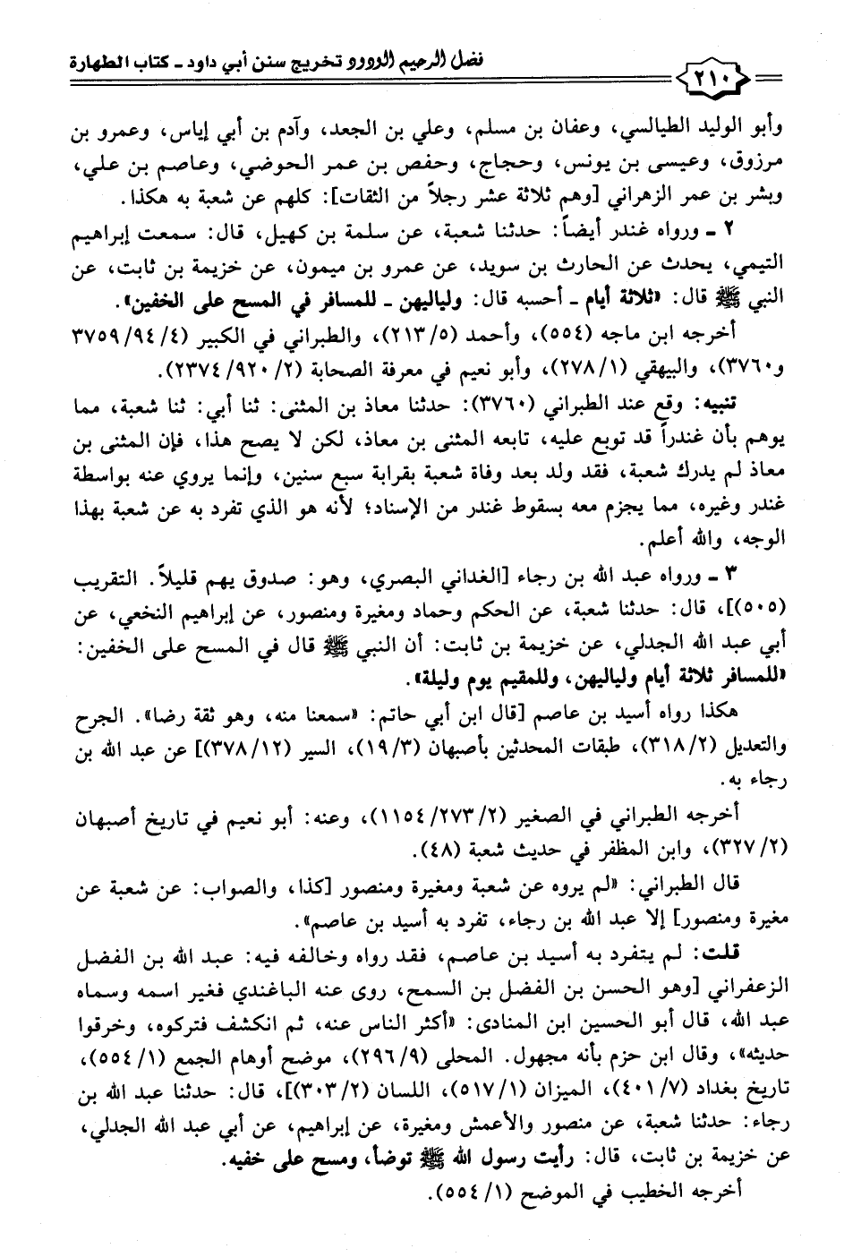 ٣ - ورواه عبد الله بن رجاء [الغداني البصري، وهو: صدوق يهم قليلًا. التقريب (٥٠٥)]، قال: حدثنا شعبة، عن الحكم وحماد ومغيرة ومنصور، عن إبراهيم النخعي، عن أبي عبد الله الجدلي، عن خزيمة بن ثابت: أن النبي - صلى الله عليه وسلم - قال في المسح على الخفين: "للمسافر ثلاثة أيام ولياليهن، وللمقيم يوم وليلة".