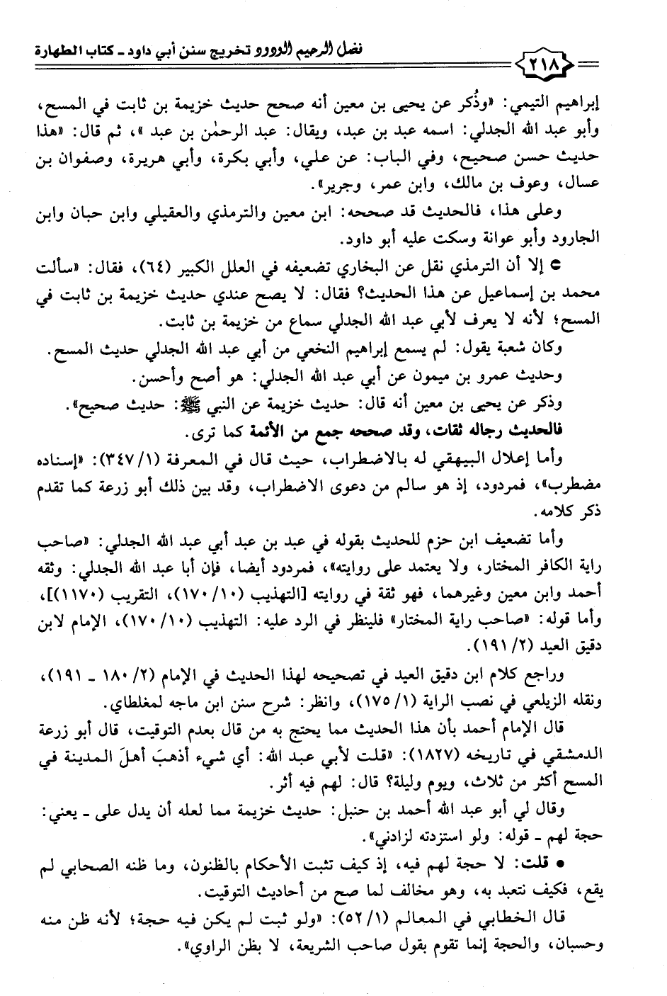 إبراهيم التيمي: "وذُكر عن يحيى بن معين أنه صحح حديث خزيمة بن ثابت في المسح، وأبو عبد الله الجدلي: اسمه عبد بن عبد، ويقال: عبد الرحمن بن عبد"، ثم قال: "هذا حديث حسن صحيح، وفي الباب: عن علي، وأبي بكرة، وأبي هريرة، وصفوان بن عسال، وعوف بن مالك، وابن عمر، وجرير".