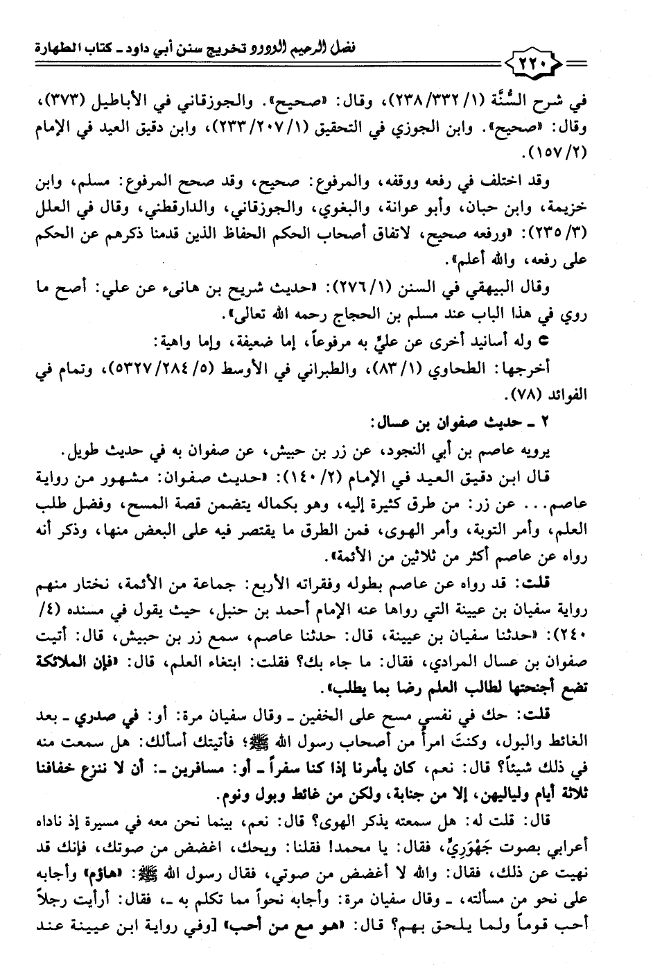 قال ابن دقيق العيد في الإمام (٢/ ١٤٠): "حديث صفوان: مشهور من رواية عاصم ... عن زر: من طرق كثيرة إليه، وهو بكماله يتضمن قصة المسح، وفضل طلب العلم، وأمر التوبة، وأمر الهوى، فمن الطرق ما يقتصر فيه على البعض منها، وذكر أنه رواه عن عاصم أكثر من ثلاثين من الأئمة".