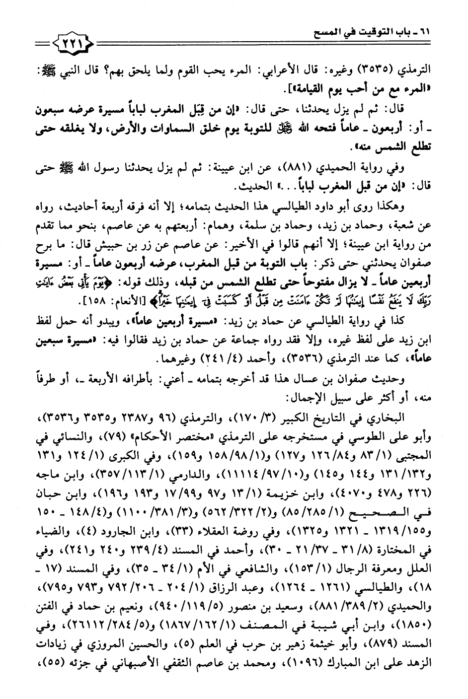 البخاري في التاريخ الكبير (٣/ ١٧٠)، والترمذي (٩٦ و ٢٣٨٧ و ٣٥٣٥ و ٣٥٣٦)، وأبو على الطوسي في مستخرجه على الترمذي "مختصر الأحكام" (٧٩)، والنسائي في المجتبى (١/ ٨٣ و ٨٤/ ١٢٦ و ١٢٧) و (١/ ٩٨/ ١٥٨ و ١٥٩)، وفي الكبرى (١/ ١٢٤ و ١٣١ و ١٣٢/ ١٣١ و ١٤٤ و ١٤٥) و (١٠/ ٩٧/ ١١١١٤)، والدارمي (١/ ١١٣/ ٣٥٧)، وابن ماجه (٢٢٦ و ٤٧٨ و ٤٠٧٠)، وابن خزيمة (١/ ١٣ و ٩٧ و ٩٩/ ١٧ و ١٩٣ و ١٩٦)، وابن حبان في الصحيح (١/ ٢٨٥/ ٨٥) و (٢/ ٣٢٢/ ٥٦٢) و (٣/ ٣٨١/ ١١٠٠) و (٤/ ١٤٨ - ١٥٠ و ١٥٥/ ١٣١٩ - ١٣٢١ و ١٣٢٥)، وفي روضة العقلاء (٣٣)، وابن الجارود (٤)، والضياء في المختارة (٨/ ٣١ - ٣٧/ ٢١ - ٣٠)، وأحمد في المسند (٤/ ٢٣٩ و ٢٤٠ و ٢٤١)، وفي العلل ومعرفة الرجال (١/ ١٥٣)، والشافعي في الأم (١/ ٣٤ - ٣٥)، وفي المسند (١٧ - ١٨)، والطيالسي (١٢٦١ - ١٢٦٤)، وعبد الرزاق (١/ ٢٠٤ - ٢٠٦/ ٧٩٢ و ٧٩٣ و ٧٩٥)، والحميدي (٢/ ٣٨٩/ ٨٨١)، وسعيد بن منصور (٥/ ١١٩/ ٩٤٠)، ونعيم بن حماد في الفتن (١٨٥٠)، وابن أبي شيبة في المصنف (١/ ١٦٢/ ١٨٦٧) و (٥/ ٢٨٤/ ٢٦١١٢)، وفي المسند (٨٧٩)، وأبو خيثمة زهير بن حرب في العلم (٥)، والحسين المروزي في زيادات الزهد على ابن المبارك (١٠٩٦)، ومحمد بن عاصم الثقفي الأصبهاني في جزئه (٥٥)،