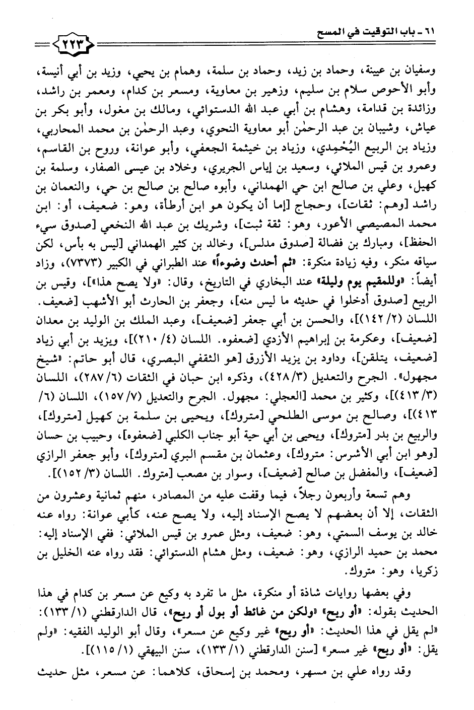 وسفيان بن عيينة، وحماد بن زيد، وحماد بن سلمة، وهمام بن يحيى، وزيد بن أبي أنيسة، وأبو الأحوص سلام بن سليم، وزهير بن معاوية، ومسعر بن كدام، ومعمر بن راشد، وزائدة بن قدامة، وهشام بن أبي عبد الله الدستوائي، ومالك بن مغول، وأبو بكر بن عياش، وشيبان بن عبد الرحمن أبو معاوية النحوي، وعبد الرحمن بن محمَّد المحاربي، وزياد بن الربيع اليُحْمِدي، وزياد بن خيثمة الجعفي، وأبو عوانة، وروح بن القاسم، وعمرو بن قيس الملائي، وسعيد بن إياس الجريري، وخلاد بن عيسى الصفار، وسلمة بن كهيل، وعلي بن صالح ابن حي الهمداني، وأبوه صالح بن صالح بن حي، والنعمان بن راشد [وهم: ثقات]، وحجاج [إما أن يكون هو ابن أرطأة، وهو: ضعيف، أو: ابن محمَّد المصيصي الأعور، وهو: ثقة ثبت]، وشريك بن عبد الله النخعي [صدوق سيء الحفظ]، ومبارك بن فضالة [صدوق مدلس]، وخالد بن كثير الهمداني [ليس به بأس، لكن سياقه منكر، وفيه زيادة منكرة: "ثم أحدث وضوءًا" عند الطبراني في الكبير (٧٣٧٣)، وزاد أيضًا: "وللمقيم يوم وليلة" عند البخاري في التاريخ, وقال: "ولا يصح هذا"]، وقيس بن الربيع [صدوق أدخلوا في حديثه ما ليس منه]، وجعفر بن الحارث أبو الأشهب [ضعيف. اللسان (٢/ ١٤٢)]، والحسن بن أبي جعفر [ضعيف]، وعبد الملك بن الوليد بن معدان [ضعيف]، وعكرمة بن إبراهيم الأزدي [ضعفوه. اللسان (٤/ ٢١٠)]، ويزيد بن أبي زياد [ضعيف، يتلقن]، وداود بن يزيد الأزرق [هو الثقفي البصري، قال أبو حاتم: "شيخ مجهول". الجرح والتعديل (٣/ ٤٢٨)، وذكره ابن حبان في الثقات (٦/ ٢٨٧)، اللسان (٣/ ٤١٣)]، وكثير بن محمَّد [العجلي: مجهول. الجرح والتعديل (٧/ ١٥٧)، اللسان (٦/ ٤١٣)]، وصالح بن موسى الطلحي [متروك]، ويحيى بن سلمة بن كهيل [متروك]، والربيع بن بدر [متروك]، ويحيى بن أبي حية أبو جناب الكلبي [ضعفوه]، وحبيب بن حسان [وهو ابن أبي الأشرس: متروك]، وعثمان بن مقسم البري [متروك]، وأبو جعفر الرازي [ضعيف]، والمفضل بن صالح [ضعيف]، وسوار بن مصعب [متروك. اللسان (٣/ ١٥٢)].