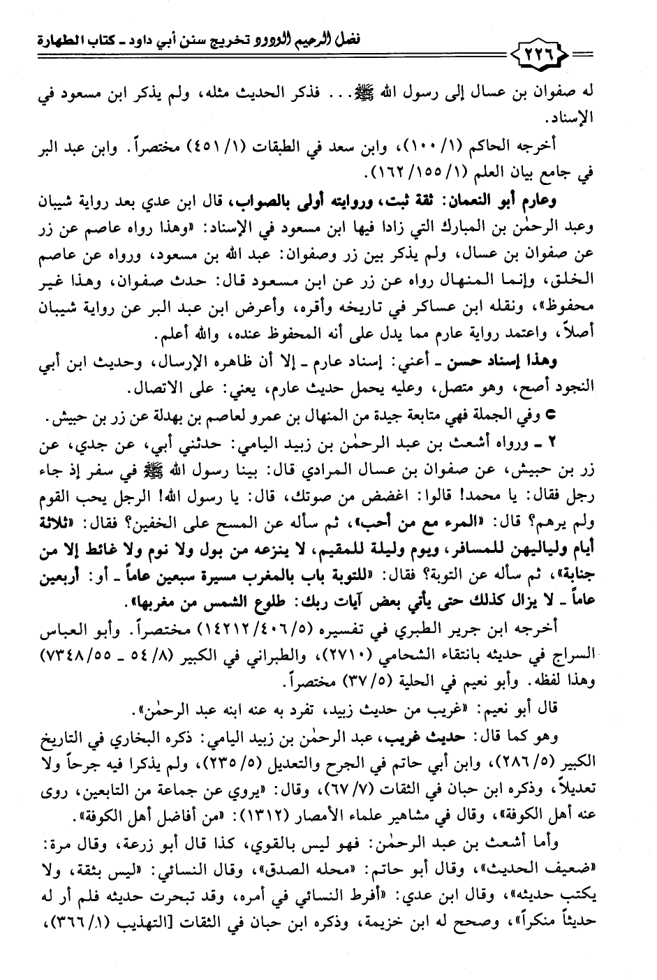 وعارم أبو النعمان: ثقة ثبت، وروايته أولى بالصواب، قال ابن عدي بعد رواية شيبان وعبد الرحمن بن المبارك التي زادا فيها ابن مسعود في الإسناد: "وهذا رواه عاصم عن زر عن صفوان بن عسال، ولم يذكر بين زر وصفوان: عبد الله بن مسعود، ورواه عن عاصم الخلق، وإنما المنهال رواه عن زر عن ابن مسعود قال: حدث صفوان، وهذا غير محفوظ"، ونقله ابن عساكر في تاريخه وأقره، وأعرض ابن عبد البر عن رواية شيبان أصلًا، واعتمد رواية عارم مما يدل على أنه المحفوظ عنده، والله أعلم.