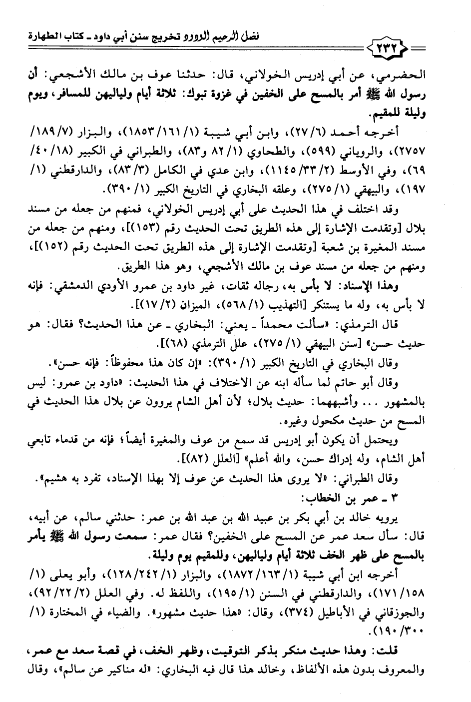 الحضرمي، عن أبي إدريس الخولاني، قال: حدثنا عوف بن مالك الأشجعي: أن رسول الله - صلى الله عليه وسلم - أمر بالمسح على الخفين في غزوة تبوك: ثلاثة أيام ولياليهن للمسافر، ويوم وليلة للمقيم.