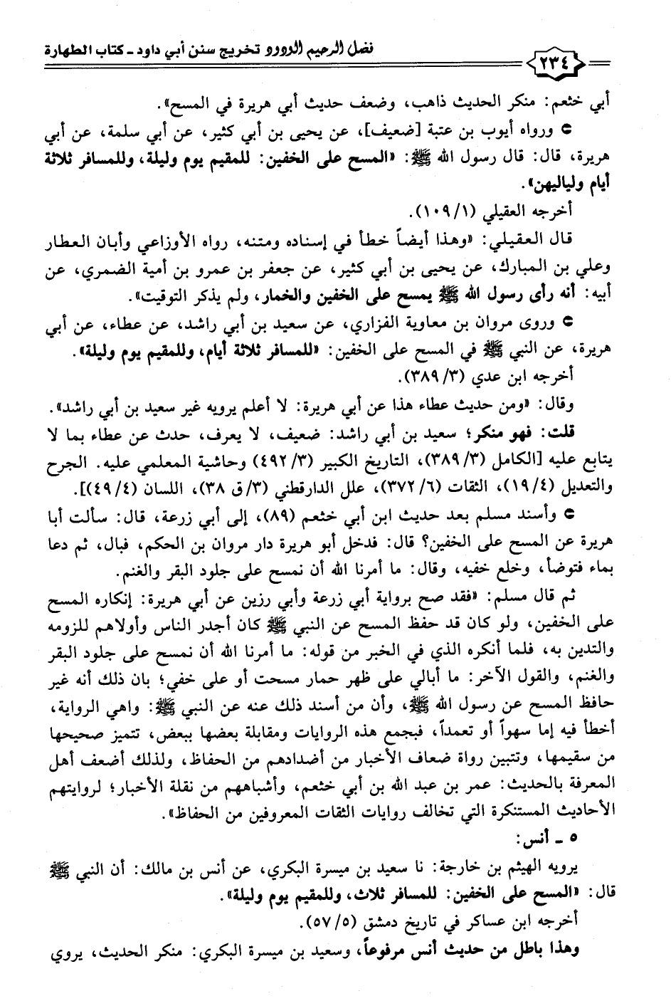 ثم قال مسلم: "فقد صح برواية أبي زرعة وأبي رزين عن أبي هريرة: إنكاره المسح على الخفين، ولو كان قد حفظ المسح عن النبي - صلى الله عليه وسلم - كان أجدر الناس وأولاهم للزومه والتدين به، فلما أنكره الذي في الخبر من قوله: ما أمرنا الله أن نمسح على جلود البقر والغنم، والقول الآخر: ما أبالي على ظهر حمار مسحت أو على خفي؛ بان ذلك أنه غير حافظ المسح عن رسول الله - صلى الله عليه وسلم -، وأن من أسند ذلك عنه عن النبي - صلى الله عليه وسلم -: واهي الرواية, أخطأ فيه إما سهوًا أو تعمدًا، فبجمع هذه الروايات ومقابلة بعضها ببعض، تتميز صحيحها من سقيمها، وتتبين رواة ضعاف الأخبار من أضدادهم من الحفاظ، ولذلك أضعف أهل المعرفة بالحديث: عمر بن عبد الله بن أبي خثعم، وأشباههم من نقلة الأخبار؛ لروايتهم الأحاديث المستنكرة التي تخالف روايات الثقات المعروفين من الحفاظ".