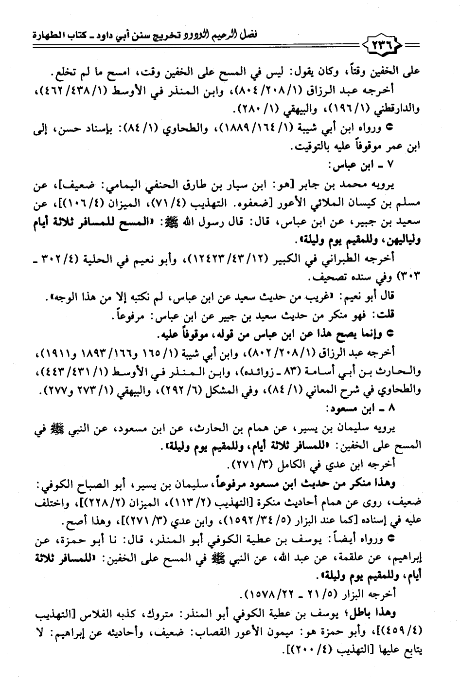 يرويه محمَّد بن جابر [هو: ابن سيار بن طارق الحنفي اليمامي: ضعيف]، عن مسلم بن كيسان الملائي الأعور [ضعفوه. التهذيب (٤/ ٧١)، الميزان (٤/ ١٠٦)]، عن سعيد بن جبير، عن ابن عباس، قال: قال رسول الله - صلى الله عليه وسلم -: "المسح للمسافر ثلاثة أيام ولياليهن، وللمقيم يوم وليلة".