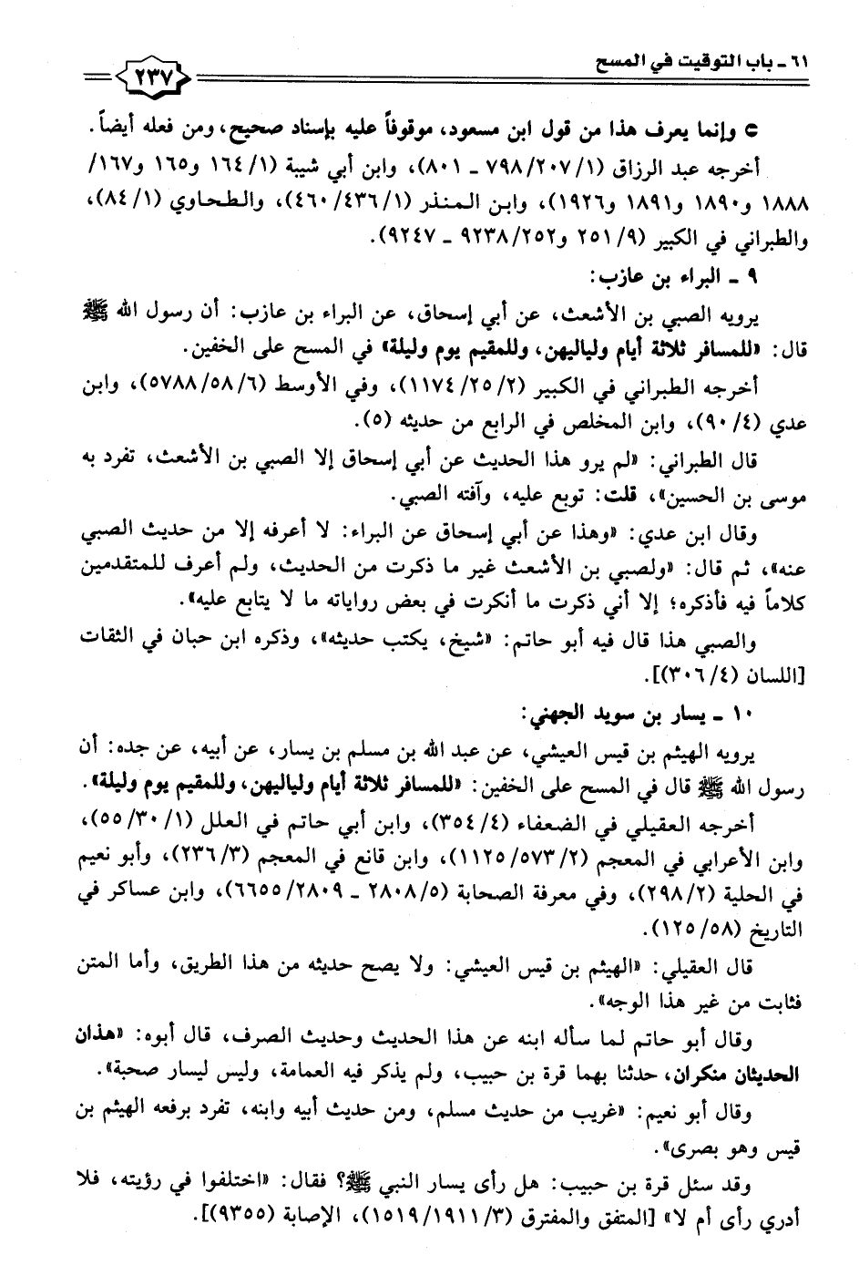 يرويه الصبي بن الأشعث، عن أبي إسحاق، عن البراء بن عازب: أن رسول الله - صلى الله عليه وسلم - قال: "للمسافر ثلاثة أيام ولياليهن، وللمقيم يوم وليلة" في المسح على الخفين.