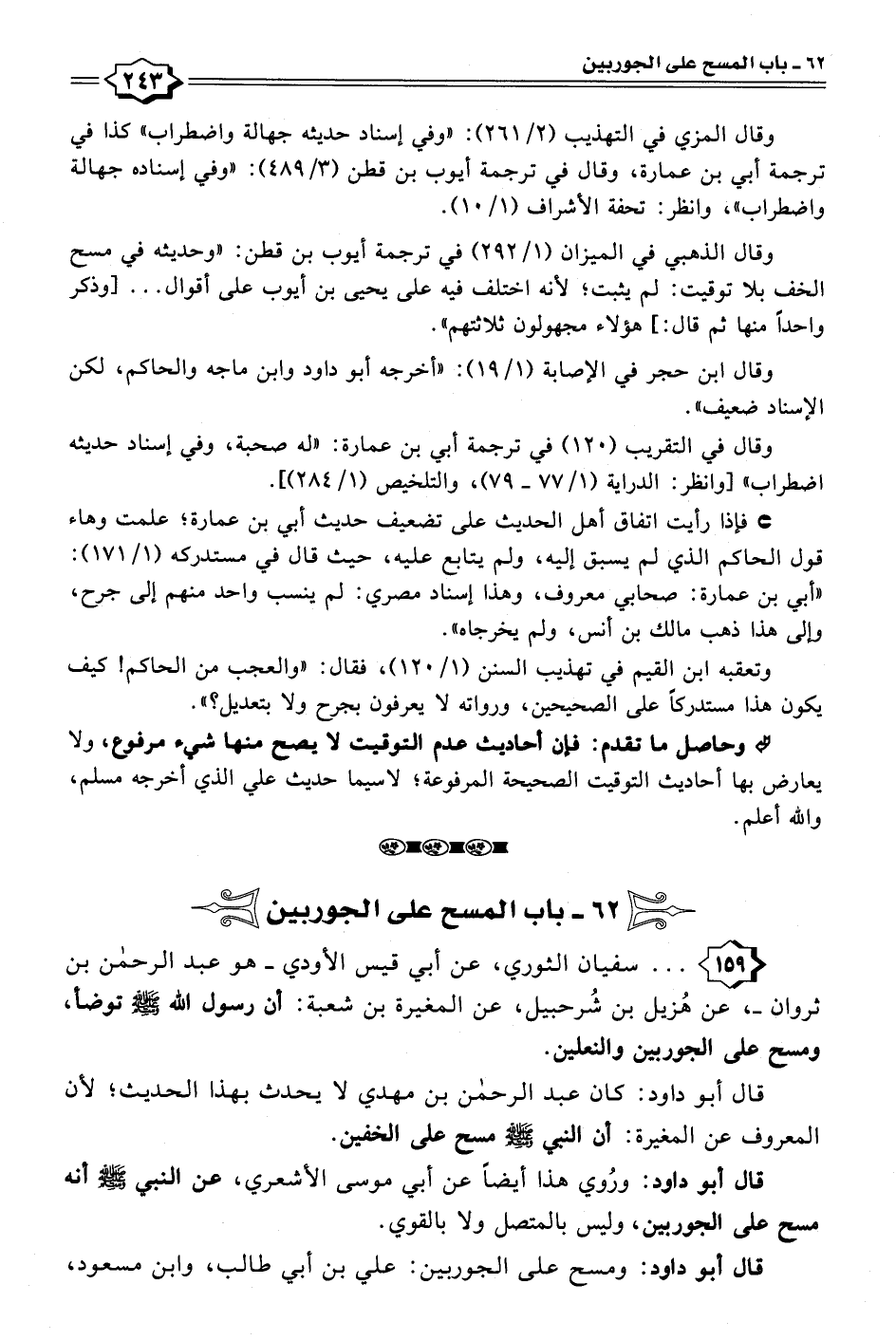 ١٥٩ - . . . سفيان الثوري، عن أبي قيس الأودي -هو عبد الرحمن بن ثروان-، عن هُزيل بن شُرحبيل، عن المغيرة بن شعبة: أن رسول الله - صلى الله عليه وسلم - توضأ، ومسح على الجوربين والنعلين.
