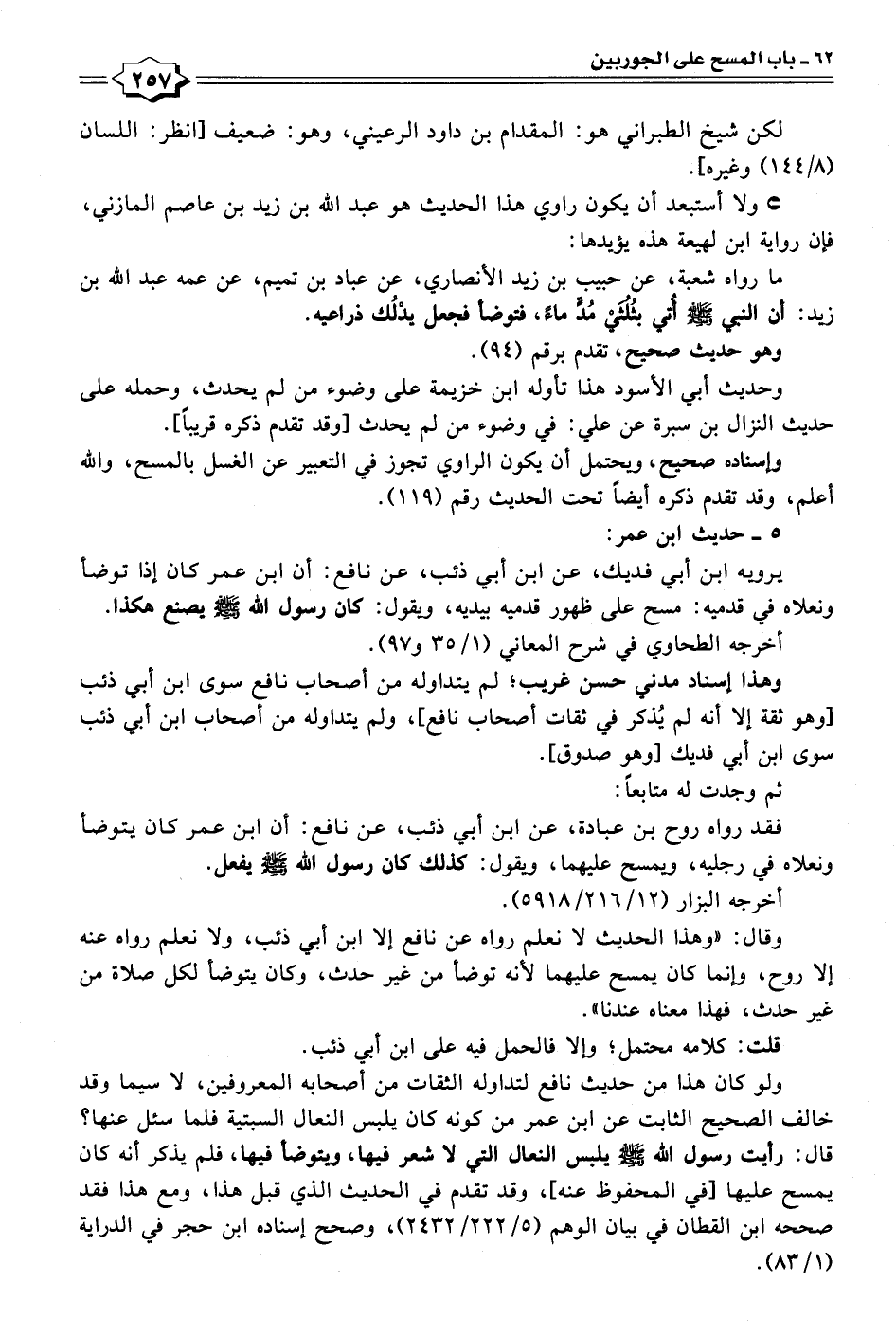ولو كان هذا من حديث نافع لتداوله الثقات من أصحابه المعروفين، لا سيما وقد خالف الصحيح الثابت عن ابن عمر من كونه كان يلبس النعال السبتية فلما سئل عنها؟ قال: رأيت رسول الله - صلى الله عليه وسلم - يلبس النعال التي لا شعر فيها، ويتوضأ فيها، فلم يذكر أنه كان يمسح عليها [في المحفوظ عنه]، وقد تقدم في الحديث الذي قبل هذا، ومع هذا فقد صححه ابن القطان في بيان الوهم (٥/ ٢٢٢/ ٢٤٣٢)، وصحيح إسناده ابن حجر في الدراية (١/ ٨٣).