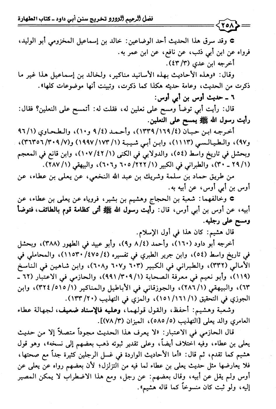 قال الحازمي في الاعتبار: "لا يعرف هذا الحديث مجودًا متصلًا إلا من حديث يعلى بن عطاء، وفيه اختلاف أيضًا، وعلى تقدير ثبوته ذهب بعضهم إلى نسخه"، وهو قول هشيم كما تقدم، ثم قال: "أما الأحاديث الواردة في غسل الرجلين كثيرة جدًّا مع صحتها، فلا يعارضها مثل حديث يعلى بن عطاء لما فيه من التزلزل؛ لأن بعضهم رواه عن يعلى عن أوس ولم يقل عن أبيه، وقال بعضهم: عن رجل، ومع هذا الاضطراب لا يمكن المصير إليه، ولو ثبت كان منسوخًا كما قاله هشيم".