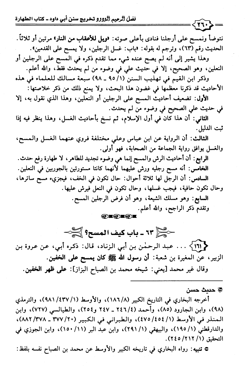 ١٦١ - . . . عبد الرحمن بن أبي الزناد، قال: ذكره أبي، عن عروة بن الزبير، عن المغيرة بن شعبة: أن رسول الله - صلى الله عليه وسلم - كان يمسح على الخفين.