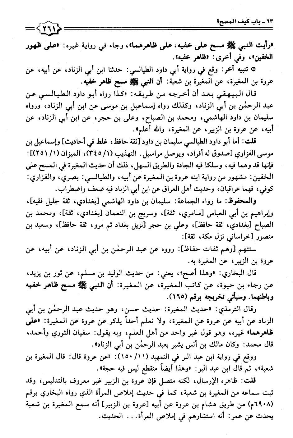 "رأيت النبي - صلى الله عليه وسلم - مسح على خفيه، على ظاهرهما"، وجاء في رواية غيره: "على ظهور الخفين"، وفي أخرى: "ظاهر خفيه".