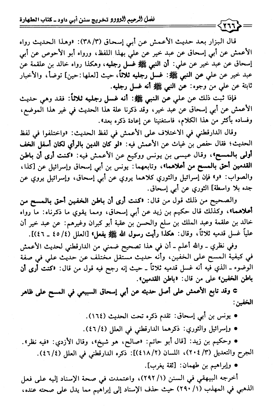 وفي نظري -والله أعلم- أن في هذا تصحيح ضمني من الدارقطني لحديث الأعمش في كيفية المسح على الخفين، وأنه حديث مستقل مختلف عن حديث علي في صفة الوضوء -الذي فيه أنه غسل قدميه ثلاثًا- حيث إنه رجح فيه قول من قال: "كنت أرى أن باطن الخفين" على من قال: "باطن القدمين".