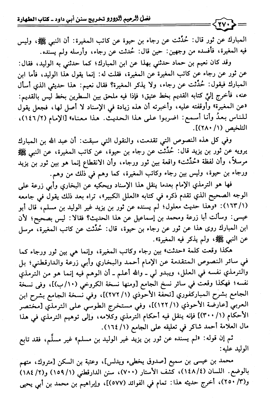 هكذا وقعت كلمة "حدثت" بين رجاء وكاتب المغيرة، وإنما هي بين ثور ورجاء كما في سائر النصوص المتقدمة عن الإمام أحمد والبخاري وأبي زرعة والدارقطني؛ بل والترمذي نفسه في العلل، ويبدو لي -والله أعلم- أن الوهم فيه إنما هو من الترمذي نفسه؛ فهكذا وقعت في سائر نسخ الجامع [ومنها نسخة الكروخي (١٠/ ب)]، وفى نسخة الجامع بشرح المباركفوري [تحفة الأحوذي (١/ ٢٧٢)]، وفي نسخة الجامع بشرح ابن العربي [عارضة الأحوذي (١/ ١٢٢)]، وفي مستخرج الطوسي على الترمذي [مختصر الأحكام (١/ ٣٠٠)] فإنه ينقل فيه أحكام الترمذي وكلامه، وإلى توهيم الترمذي في هذا مال العلامة أحمد شاكر في تعليقه على الجامع (١/ ١٦٤).