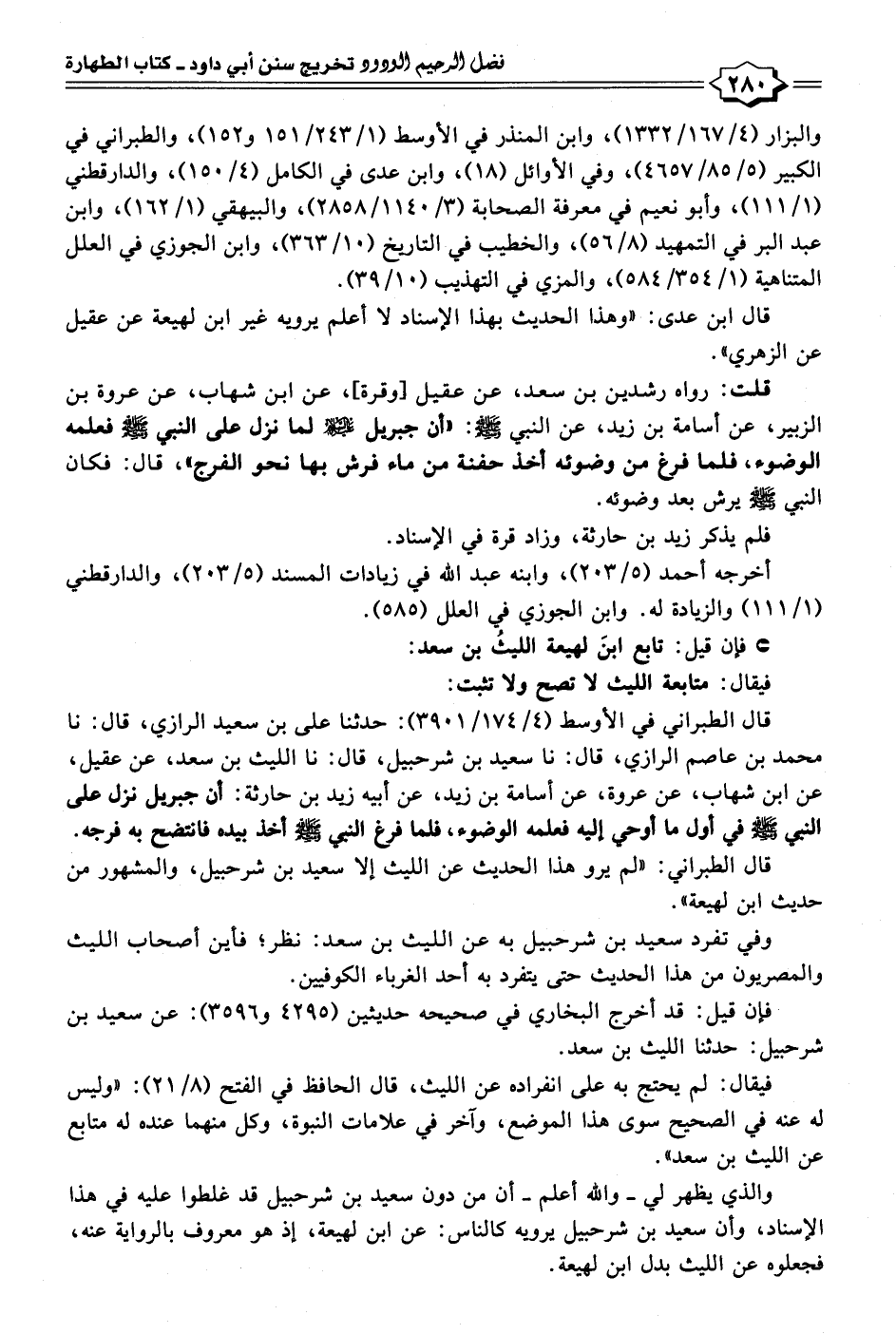 قلت: رواه رشدين بن سعد، عن عقيل [وقرة]، عن ابن شهاب، عن عروة بن الزبير، عن أسامة بن زيد، عن النبي - صلى الله عليه وسلم -: "أن جبريل عليه السلام لما نزل على النبي - صلى الله عليه وسلم - فعلمه الوضوء، فلما فرغ من وضوئه أخد حفنة من ماء فرش بها نحو الفرج"، قال: فكان النبي - صلى الله عليه وسلم - يرش بعد وضوئه.