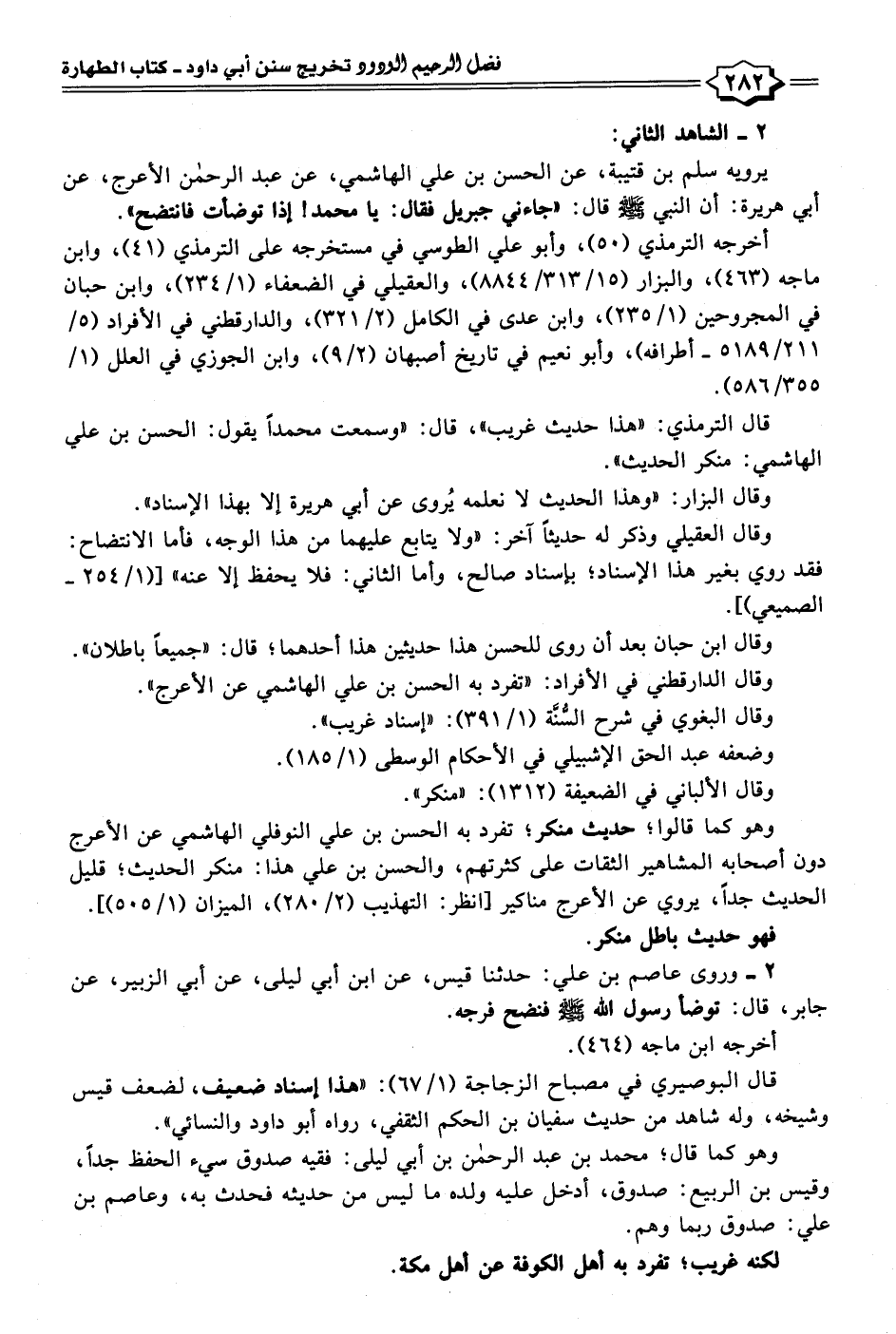 يرويه سلم بن قتيبة، عن الحسن بن علي الهاشمي، عن عبد الرحمن الأعرج، عن أبي هريرة: أن النبي - صلى الله عليه وسلم - قال: "جاءني جبريل فقال: يا محمد! إذا توضأت فانتضح".