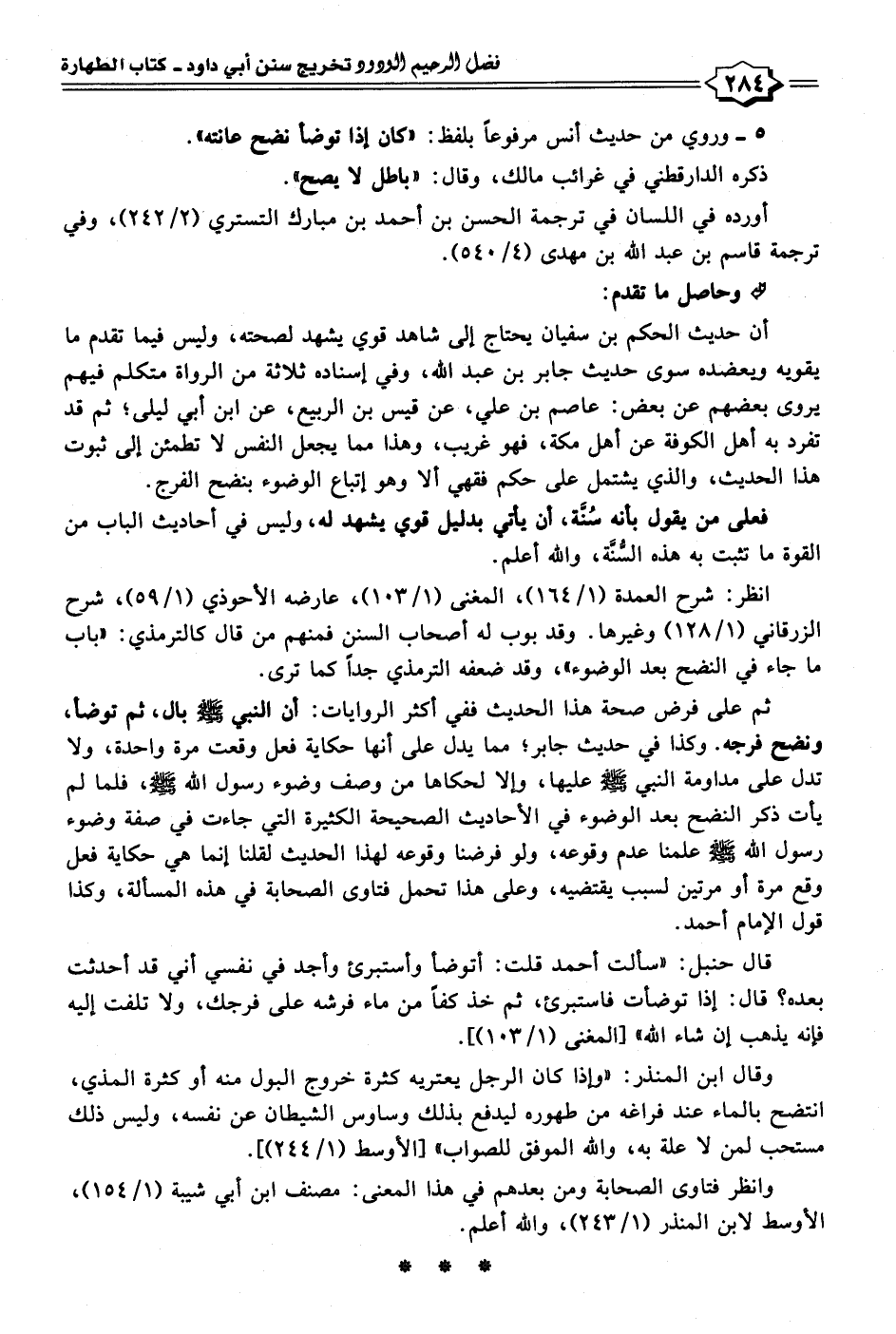 انظر: شرح العمدة (١/ ١٦٤)، المغنى (١/ ١٠٣)، عارضه الأحوذي (١/ ٥٩)، شرح الزرقاني (١/ ١٢٨) وغيرها. وقد بوب له أصحاب السنن فمنهم من قال كالترمذي: "باب ما جاء في النضح بعد الوضوء"، وقد ضعفه الترمذي جدًّا كما ترى.