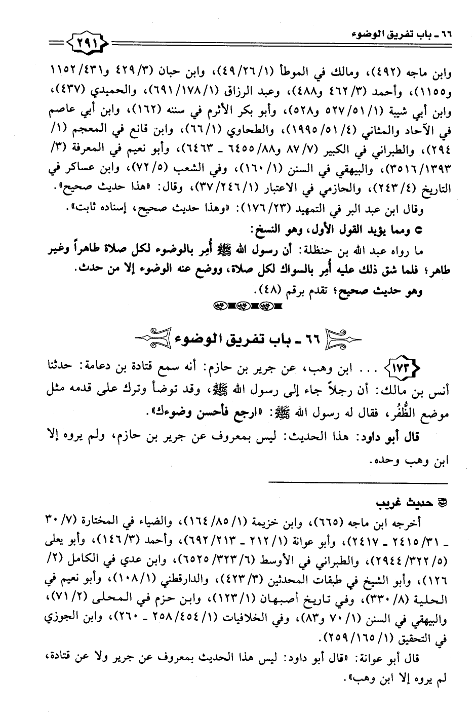 ١٧٣ - . . . ابن وهب، عن جرير بن حازم: أنه سمع قتادة بن دعامة: حدثنا أنس بن مالك: أن رجلًا جاء إلى رسول الله - صلى الله عليه وسلم -، وقد توضأ وترك على قدمه مثل موضع الظُّفُر، فقال له رسول الله - صلى الله عليه وسلم -: "ارجع فأحسن وضوءك".
