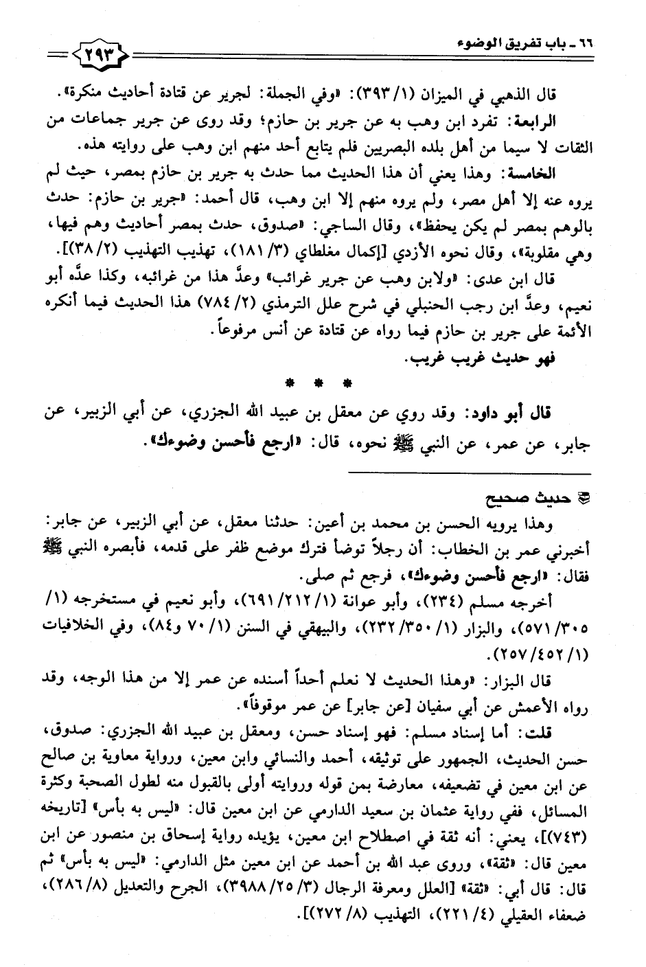 قال أبو داود: وقد روي عن معقل بن عبيد الله الجزري، عن أبي الزبير، عن جابر، عن عمر، عن النبي - صلى الله عليه وسلم - نحوه، قال: "ارجع فأحسن وضوءك".