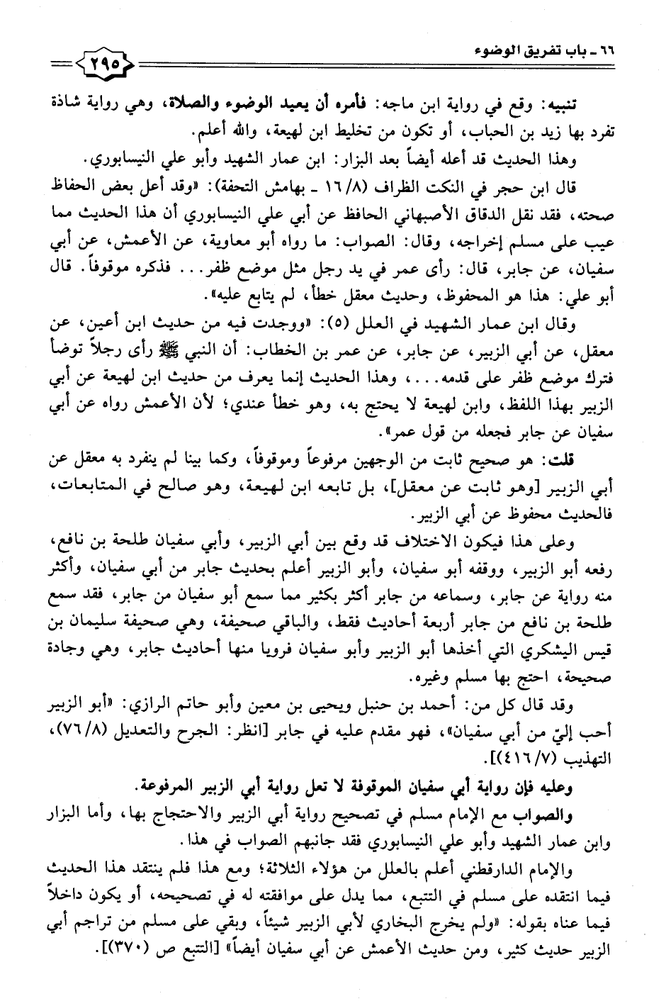 وعلى هذا فيكون الاختلاف قد وقع بين أبي الزبير، وأبي سفيان طلحة بن نافع، رفعه أبو الزبير، ووقفه أبو سفيان، وأبو الزبير أعلم بحديث جابر من أبي سفيان، وأكثر منه رواية عن جابر، وسماعه من جابر أكثر بكثير مما سمع أبو سفيان من جابر، فقد سمع طلحة بن نافع من جابر أربعة أحاديث فقط، والباقي صحيفة، وهي صحيفة سليمان بن قيس اليشكري التي أخذها أبو الزبير وأبو سفيان فرويا منها أحاديث جابر، وهي وجادة صحيحة، احتج بها مسلم وغيره.