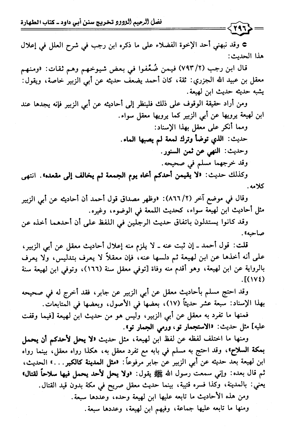 ومنها ما اختلف لفظه عن لفظ ابن لهيعة، مثل حديث "لا يحل لأحدكم أن يحمل بمكة السلاح"، وقد احتج به مسلم في بابه مع تفرد معقل به، هكذا رواه معقل، بينما رواه ابن لهيعة بعد حديثه عن أبي الزبير عن جابر مرفوعًا: "مثل المدينة كالكير ... " الحديث، ثم قال بعده: وإني سمعت رسول الله - صلى الله عليه وسلم - يقول: "ولا يحل لأحد يحمل فيها صلاحًا لقتال" يعني: بالمدينة، وكذا فسره قتيبة، بينما حديث معقل صريح في مكة بدون قيد القتال.