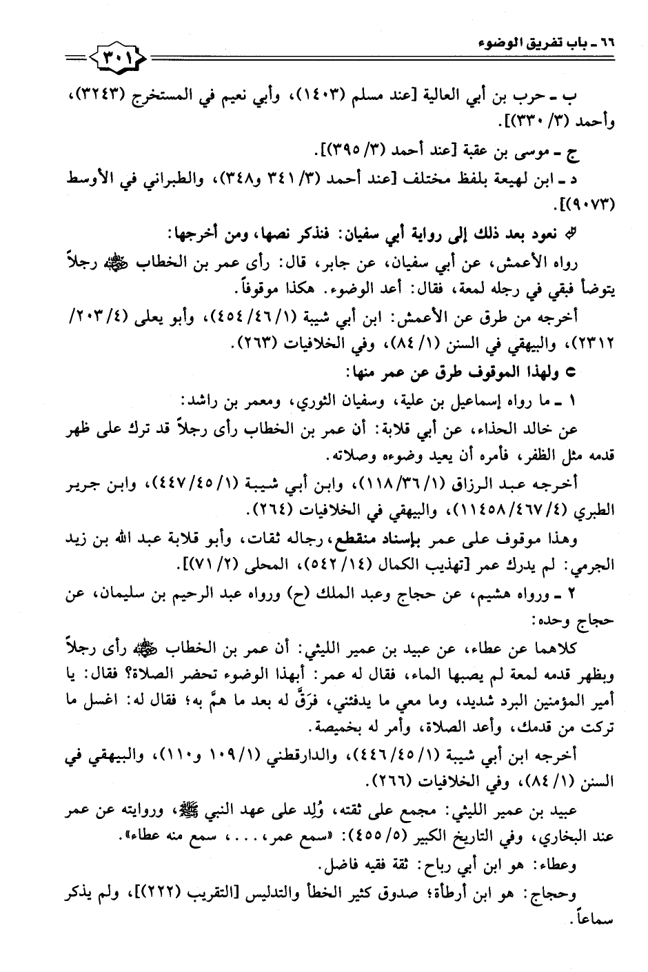 رواه الأعمش، عن أبي سفيان، عن جابر، قال: رأى عمر بن الخطاب - رضي الله عنه - رجلًا يتوضأ فبقي في رجله لمعة، فقال: أعد الوضوء. هكذا موقوفًا.