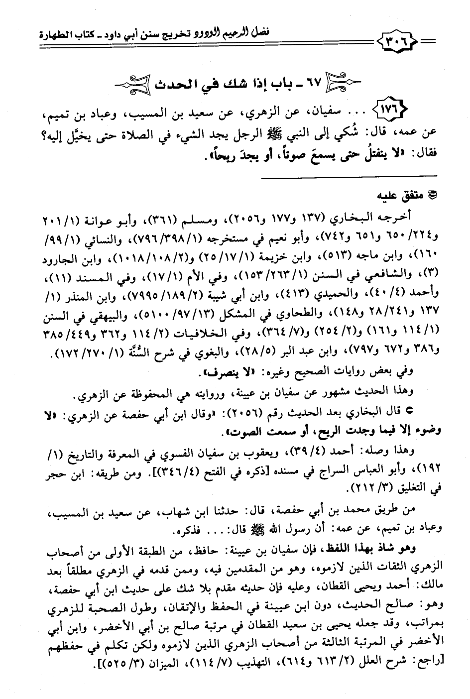١٧٦ - . . . سفيان، عن الزهري، عن سعيد بن المسيب، وعباد بن تميم، عن عمه، قال: شُكي إلى النبي - صلى الله عليه وسلم - الرجل يجد الشيء في الصلاة حتى يخيَّل إليه؟ فقال: "لا ينفتلُ حتى يسمعَ صوتًا، أو يجدَ ريحًا".