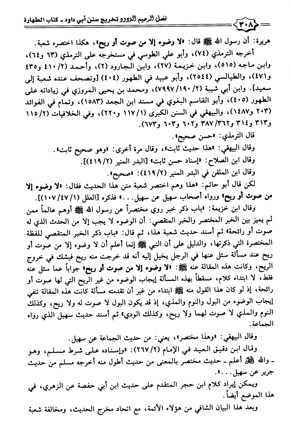 وقال ابن خزيمة: "باب ذكر خبر روي مختصرًا عن رسول الله - صلى الله عليه وسلم - أوهم عالمًا ممن لم يميز بين الخبر المختصر والخبر المتقصي: أن الوضوء لا يجب إلا من الحدث الذي له صوت أو رائحة" ثم أسند حديث شعبة هذا، ثم قال: "باب ذكر الخبر المتقصي للفظة المختصرة التي ذكرتها، والدليل على أن النبي - صلى الله عليه وسلم - إنما أعلم أن لا وضوء إلا من صوت أو ريح عند مسألة سئل عنها في الرجل يخيل إليه أنه قد خرجت منه ريح فيشك في خروج الريح، وكانت هذه المقالة عنه - صلى الله عليه وسلم -: "لا وضوء إلا من صوت أو ريح" جوابًا عما سئل عنه فقط، لا ابتداء كلام، مسقطًا بهذه المسألة إيجاب الوضوء من غير الريح التي لها صوت أو رائحة، إذ لو كان هذا القول منه - صلى الله عليه وسلم - ابتداء من غير أن تقدمته مسألة كانت هذه المقالة تنفي إيجاب الوضوء من البول والنوم والمذي، إذ قد يكون البول لا صوت له ولا ريح، وكذلك النوم والمذي لا صوت لهما ولا ريح، وكذلك الودي" ثم أسند حديث سهيل الذي رواه الجماعة.