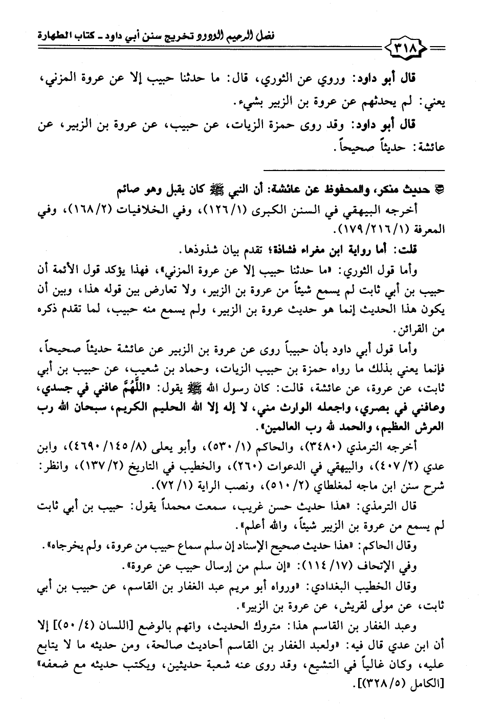 وأما قول أبي داود بأن حبيبًا روى عن عروة بن الزبير عن عائشة حديثًا صحيحًا، فإنما يعني بذلك ما رواه حمزة بن حبيب الزيات، وحماد بن شعيب، عن حبيب بن أبي ثابت، عن عروة، عن عائشة، قالت: كان رسول الله - صلى الله عليه وسلم - يقول: "اللَّهُمَّ عافني في جسدي، وعافني في بصري، واجعله الوارث مني، لا إله إلا الله الحليم الكريم، سبحان الله رب العرش العظيم، والحمد لله رب العالمين".