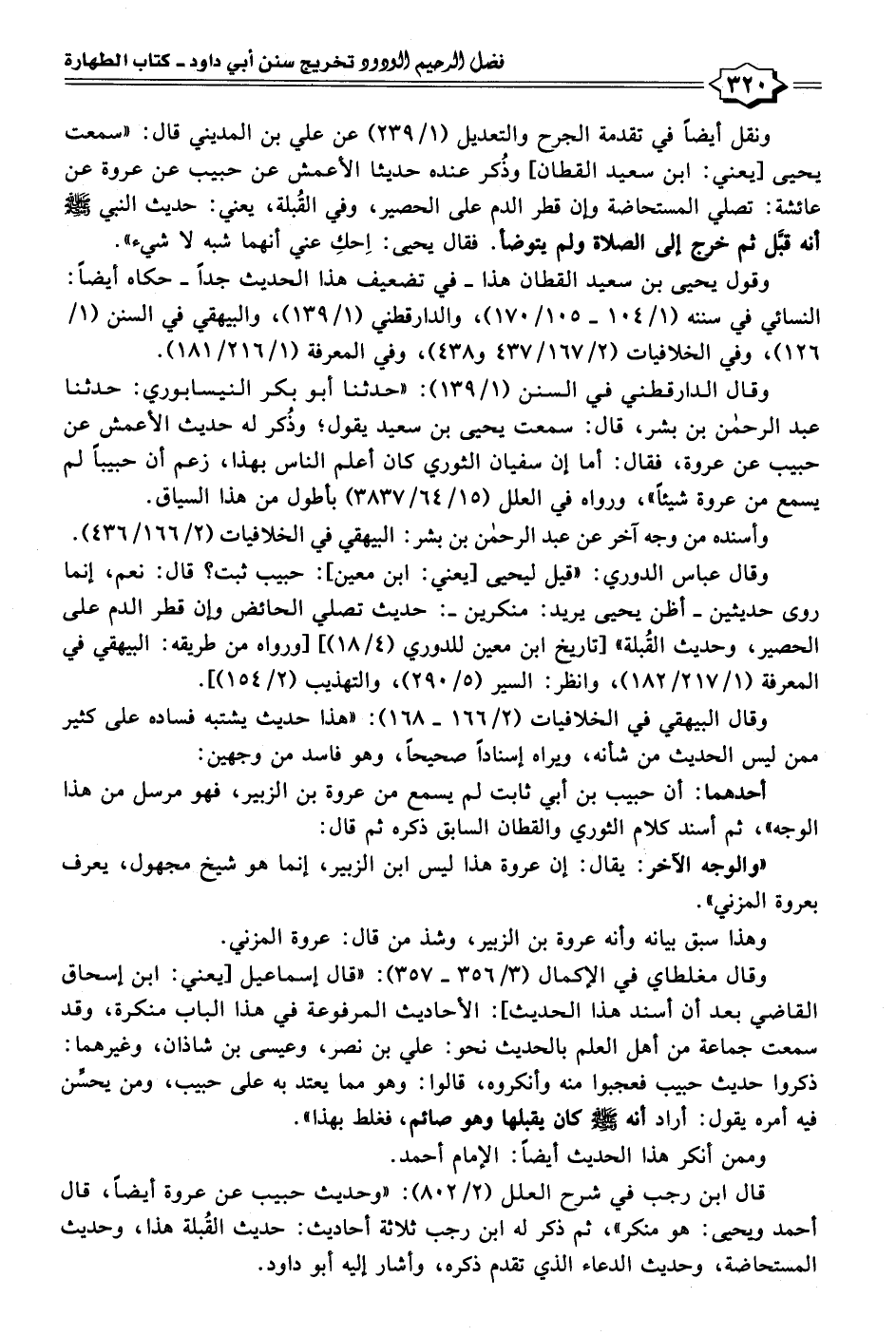 ونقل أيضًا في تقدمة الجرح والتعديل (١/ ٢٣٩) عن علي بن المديني قال: "سمعت يحيى [يعني: ابن سعيد القطان] وذُكر عنده حديثا الأعمش عن حبيب عن عروة عن عائشة: تصلي المستحاضة وإن قطر الدم على الحصير، وفي القُبلة، يعني: حديث النبي - صلى الله عليه وسلم - أنه قبَّل ثم خرج إلى الصلاة ولم يتوضأ. فقال يحيى: اِحكِ عني أنهما شبه لا شيء".
