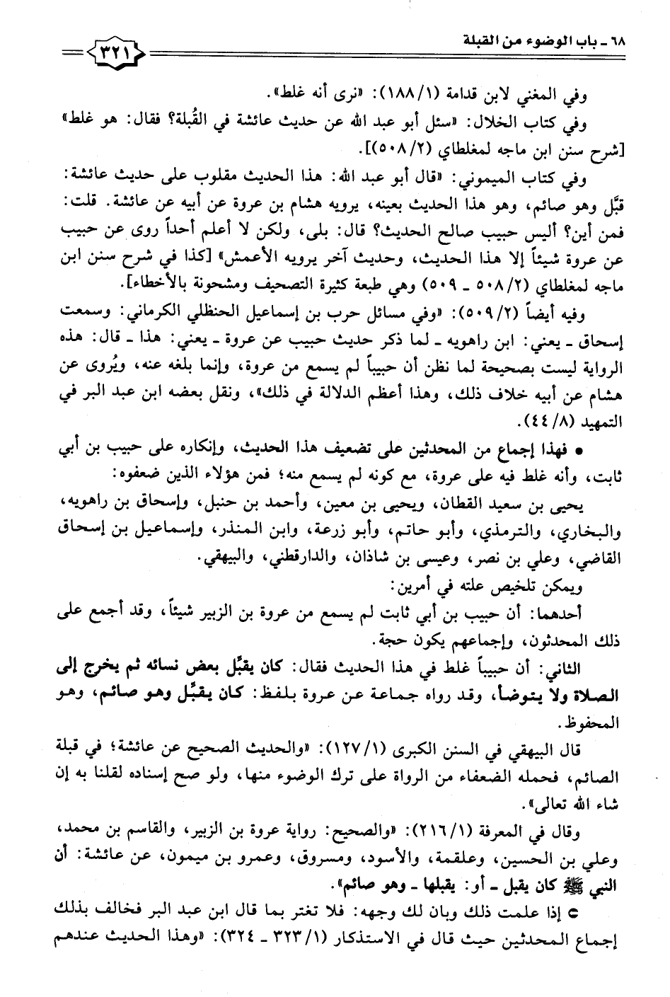 الثاني: أن حبيبًا غلط في هذا الحديث فقال: كان يقبِّل بعض نسائه ثم يخرج إلى الصلاة ولا يتوضأ، وقد رواه جماعة عن عروة بلفظ: كان يقبِّل وهو صائم، وهو المحفوظ.