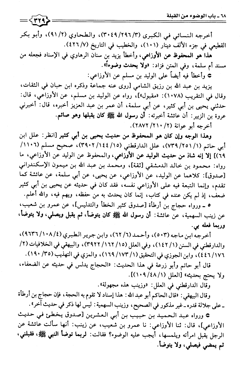 ٥ - ورواه حجاج بن أرطأة [صدوق كثير الخطأ والتدليس]، عن عمرو بن شعيب، عن زينب السهمية، عن عائشة: أن رسول الله - صلى الله عليه وسلم - كان يتوضأ، ثم يقبل ويصلي، ولا يتوضأ، وربما فعله بي.