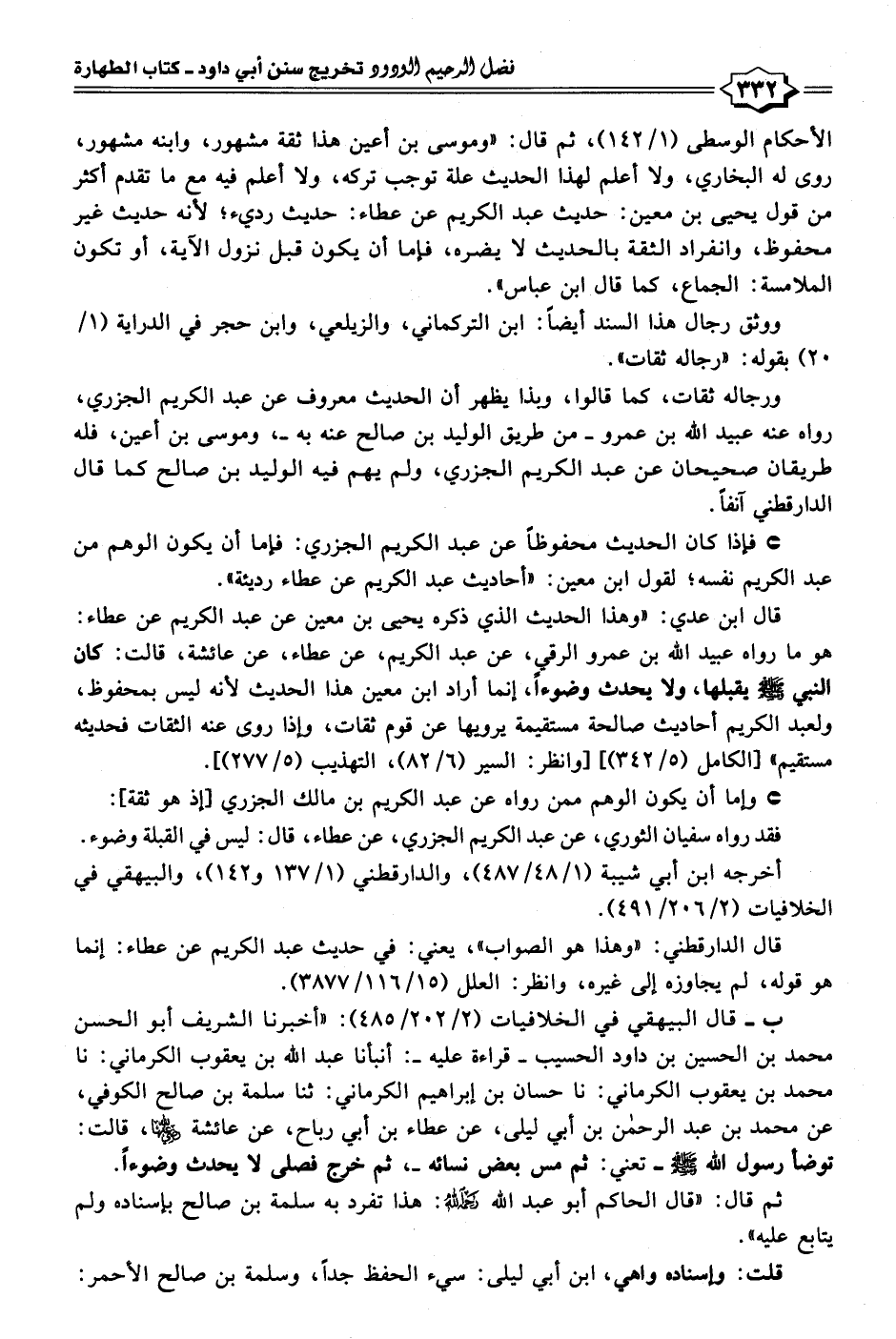 الأحكام الوسطى (١/ ١٤٢)، ثم قال: "وموسى بن أعين هذا ثقة مشهور، وابنه مشهور، روى له البخاري، ولا أعلم لهذا الحديث علة توجب تركه، ولا أعلم فيه مع ما تقدم أكثر من قول يحيى بن معين: حديث عبد الكريم عن عطاء: حديث رديء؛ لأنه حديث غير محفوظ، وانفراد الثقة بالحديث لا يضره، فإما أن يكون قبل نزول الآية، أو تكون الملامسة: الجماع، كما قال ابن عباس".