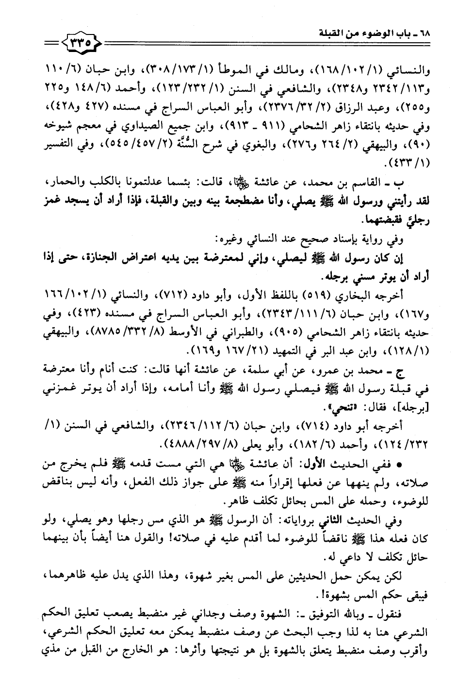 وفي الحديث الثاني برواياته: أن الرسول - صلى الله عليه وسلم - هو الذي مس رجلها وهو يصلي، ولو كان فعله هذا - صلى الله عليه وسلم - ناقضًا للوضوء لما أقدم عليه في صلاته! والقول هنا أيضًا بأن بينهما حائل تكلف لا داعي له.