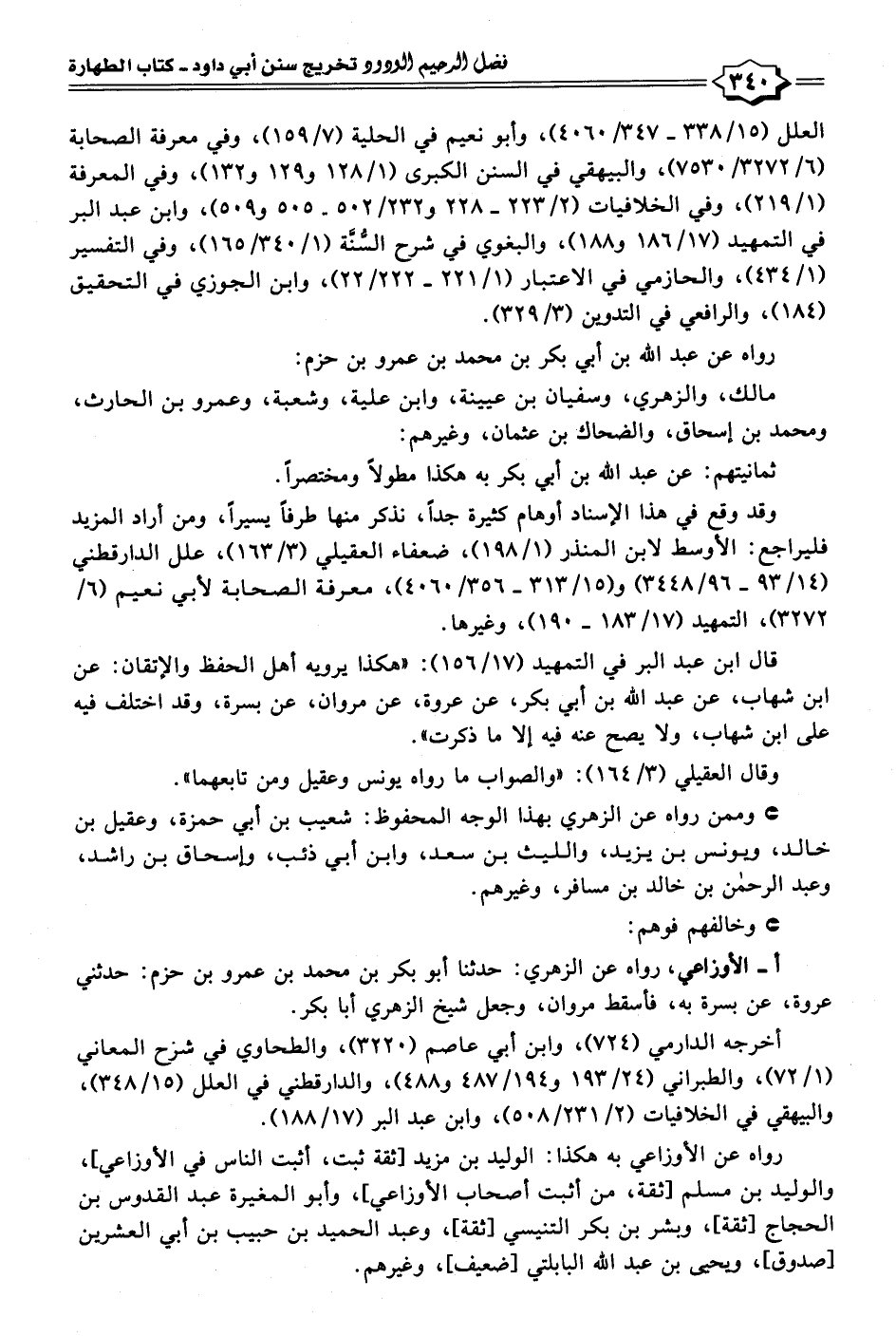 العلل (١٥/ ٣٣٨ - ٣٤٧/ ٤٠٦٠)، وأبو نعيم في الحلية (٧/ ١٥٩)، وفي معرفة الصحابة (٦/ ٣٢٧٢/ ٧٥٣٠)، والبيهقي في السنن الكبرى (١/ ١٢٨ و ١٢٩ و ١٣٢)، وفي المعرفة (١/ ٢١٩)، وفي الخلافيات (٢/ ٢٢٣ - ٢٢٨ و ٢٣٢/ ٥٠٢، ٥٠٥ و ٥٠٩)، وابن عبد البر في التمهيد (١٧/ ١٨٦ و ١٨٨)، والبغوي في شرح السُّنَّة (١/ ٣٤٠/ ١٦٥)، وفي التفسير (١/ ٤٣٤)، والحازمي في الاعتبار (١/ ٢٢١ - ٢٢٢/ ٢٢)، وابن الجوزي في التحقيق (١٨٤)، والرافعي في التدوين (٣/ ٣٢٩).
