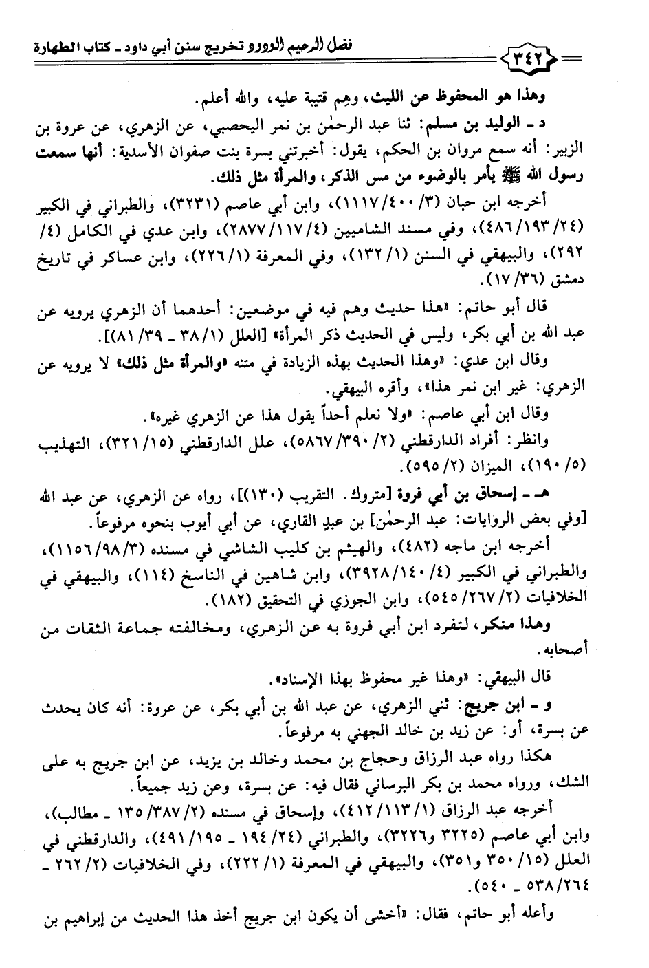 د - الوليد بن مسلم: ثنا عبد الرحمن بن نمر اليحصبي، عن الزهري، عن عروة بن الزبير: أنه سمع مروان بن الحكم، يقول: أخبرتني بسرة بنت صفوان الأسدية: أنها سمعت رسول الله - صلى الله عليه وسلم - يأمر بالوضوء من مس الذكر، والمرأة مثل ذلك.