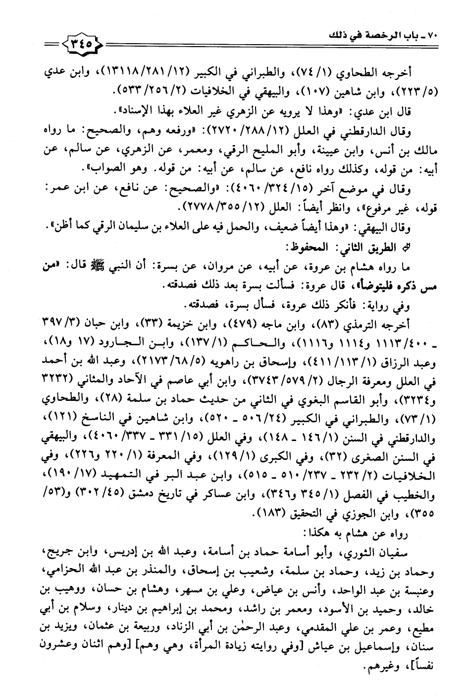 أخرجه الترمذي (٨٣)، وابن ماجه (٤٧٩)، وابن خزيمة (٣٣)، وابن حبان (٣/ ٣٩٧ - ٤٠٠/ ١١١٣ و ١١١٤ و ١١١٦)، والحاكم (١/ ١٣٧)، وابن الجارود (١٧ و ١٨)، وعبد الرزاق (١/ ١١٣/ ٤١١)، وإسحاق بن راهويه (٥/ ٦٨/ ٢١٧٣)، وعبد الله بن أحمد في العلل ومعرفة الرجال (٢/ ٥٧٩/ ٣٧٤٣)، وابن أبي عاصم في الآحاد والمثاني (٣٢٣٢ و ٣٢٣٤)، وأبو القاسم البغوي - في الثاني من حديث حماد بن سلمة (٢٨)، والطحاوي (١/ ٧٣)، والطبراني في الكبير (٢٤/ ٥٠٦ - ٥٢٠)، وابن شاهين في الناسخ (١٢١)، والدارقطني في السنن (١/ ١٤٦ - ١٤٨)، وفي العلل (١٥/ ٣٣١ - ٣٣٧/ ٤٠٦٠)، والبيهقي في السنن الصغرى (٣٢)، وفي الكبرى (١/ ١٢٩)، وفي المعرفة (١/ ٢٢٠ و ٢٢٦)، وفي الخلافيات (٢/ ٢٣٢ - ٢٣٧/ ٥١٠ - ٥١٥)، وابن عبد البر في التمهيد (١٧/ ١٩٠)، والخطيب في الفصل (١/ ٣٤٥ و ٣٤٦)، وابن عساكر في تاريخ دمشق (٤٥/ ٣٠٢) و (٥٣/ ٣٥٥)، وابن الجوزي في التحقيق (١٨٣).